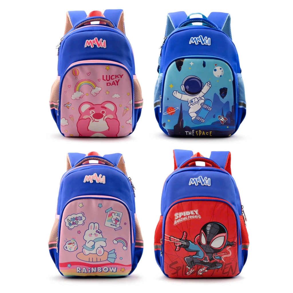 Được làm từ vải xốp 877 PVC chống thấm, chống bám bụi, bên trong được lót vải Poly Oxford giữ cho vật dụng bên trong luôn luôn khô ráo. Phía sau balo có lớp đệm lưng lưới thoáng khí, phân tán khí giữ lưng bé luôn thoáng mát, khô ráo và giảm tình trạng đau lưng cho bé. Quai đeo có lớp đệm giảm tình trạng đau vai cho bé khi sử dụng balo trong thời gian dài hoặc khi mang nặng. Ngoài ra, phần quai được đính kèm đoạn dây phản quang phát sáng khi đi vào ban đêm bảo vệ an toàn cho các bé khi đi học vào ban đêm. Ngăn chính được thiết kế với kích thước lớn, các bé có thể đem nhiều đồ cũng như sách vở đến trường. Các ngăn phụ có thể chứa bút viết, sổ tay,... tránh tình trạng thất lạc đồ, phục vụ tốt hơn trong quá trình học tập của các bé.