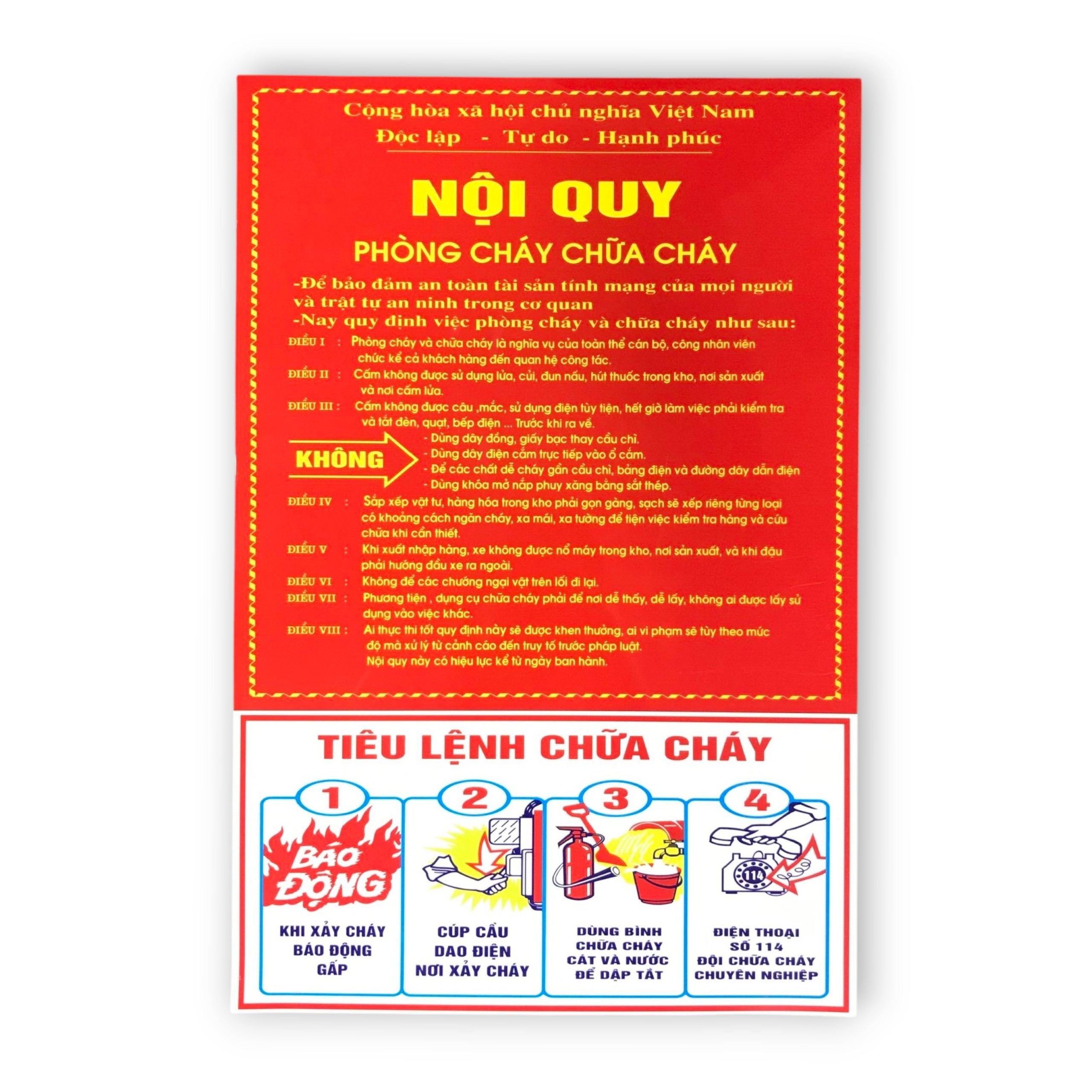 Bộ bảng Nội quy và tiêu lệnh PCCC được làm từ nhựa PP cán màng mica có độ dày 0.5mm cho độ bền cao. Ngoài ra, sản phẩm được thiết kế đúng theo đúng quy chuẩn của Bộ Công an với nội dung và hình ảnh cảnh báo được in rõ nét bằng các màu đặc trưng trong lĩnh vực phòng cháy chữa cháy: đỏ, vàng, trắng và xanh. Đảm bảo dễ nhìn, dễ nhận biết trong nhiều điều kiện môi trường khác nhau.