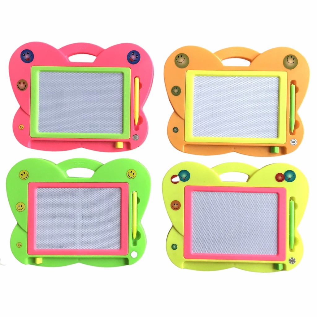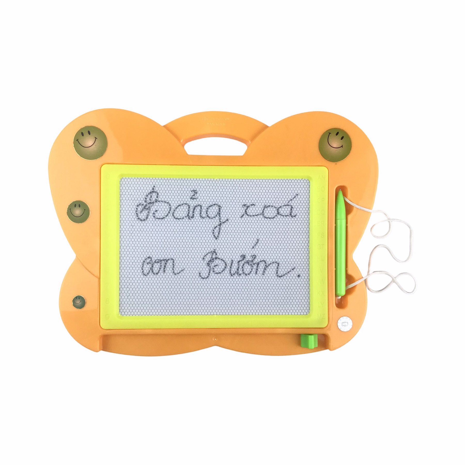 Được làm từ nhựa, đầu bút làm bằng kim loại không có mực, bảng có cần gạt bên dưới chỉ cần gạt nhẹ qua là những gì bé viết sẽ tự xóa hết.