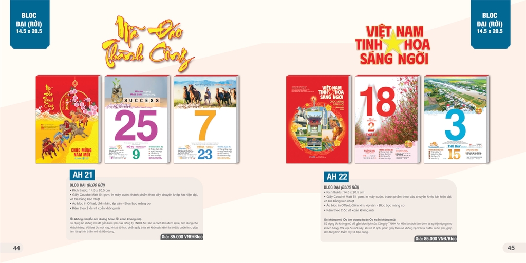 Được làm từ giấy Couché Matt 54 gsm, in máy cuộn, thành phẩm theo dây chuyền khép kín hiện đại, vô bìa bằng keo nhiệt, áo bloc in offset, điểm kim, ép vân, bloc bọc màng co, kèm theo 2 ốc vít xoắn không mũ. Với loại ốc mới này, khi xé tờ lịch, phần giấy thừa sẽ không bị dính lại ở đầu cuốn lịch, giúp làm tăng tính thẩm mỹ và tiện dụng.