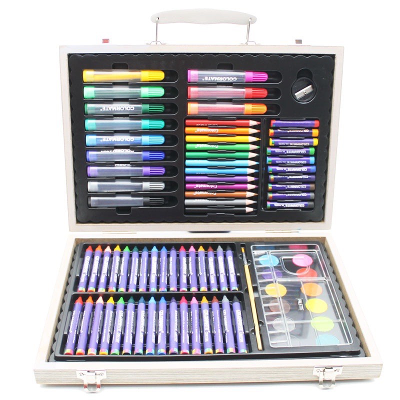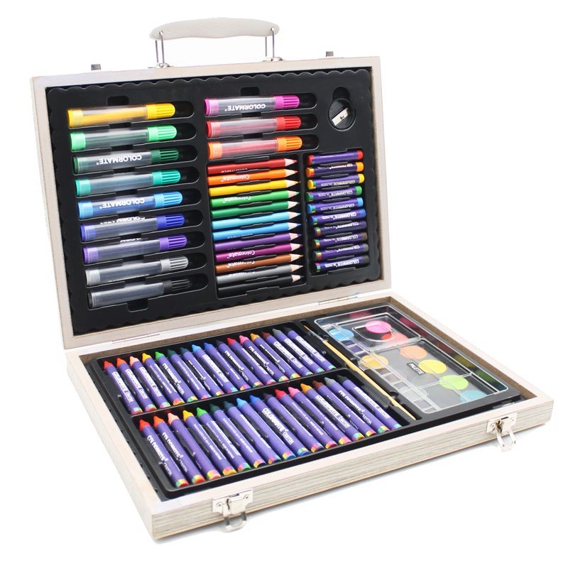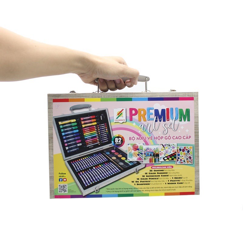 Sản phẩm được đựng trong hộp gỗ chắc chắn, màu sắc đa dạng và tươi sáng, an toàn cho sức khỏe người tiêu dùng. Bộ màu bao gồm: 10 bút sáp dầu, 32 bút sáp màu, 12 bút chì màu, 12 bút lông màu nước, 1 khay pha màu, 1 cọ vẽ, 1 chuốt chì, 1 gôm và 1 hộp gỗ.