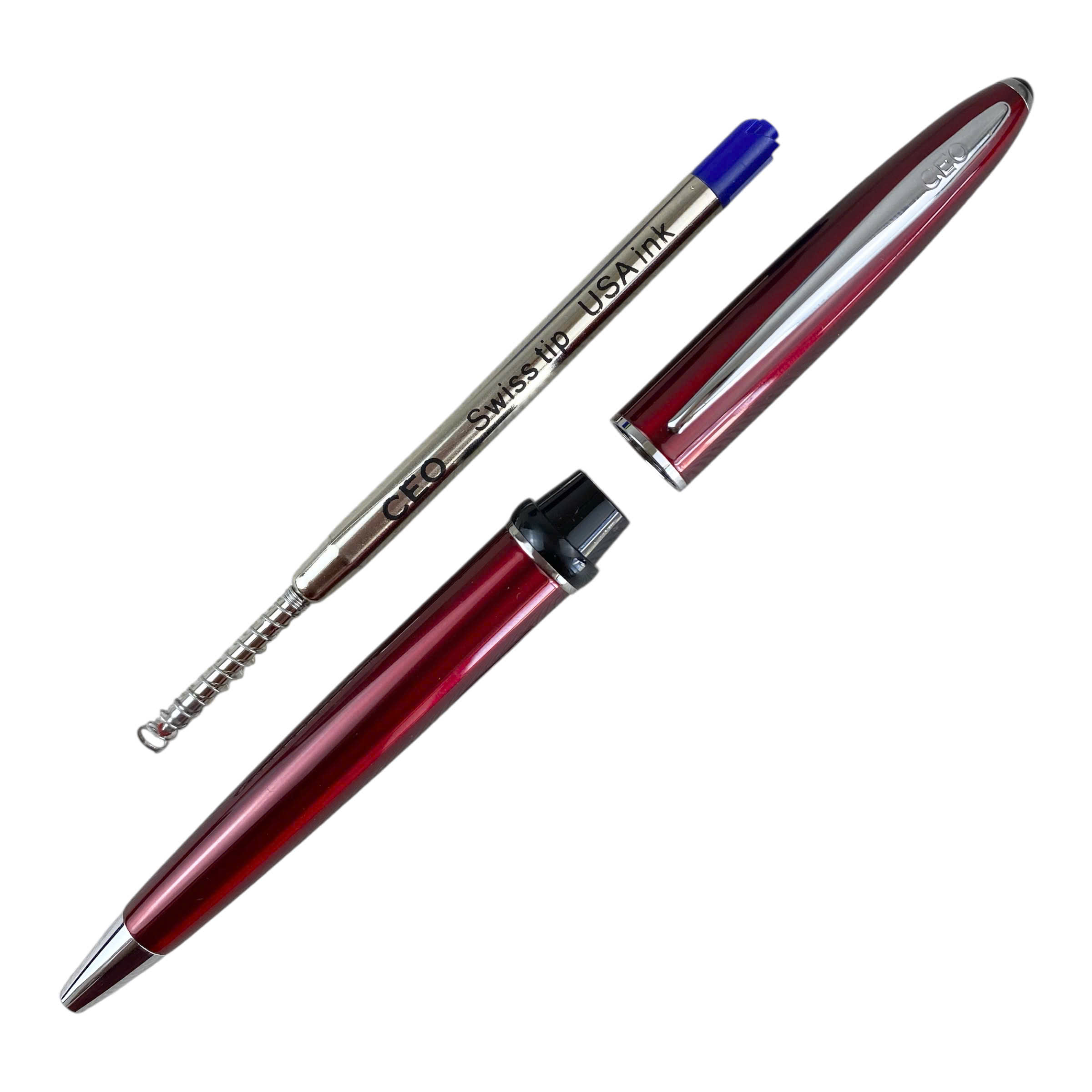 Được làm bằng inox sơn đỏ, mạ viền đen trên đai, mạ bạc sáng bóng trên ngòi và thanh cài, phần trên thân của thân cài được khắc tên thương hiệu CEO để tạo nên điểm nhấn độc đáo, thân bút xoay dễ dàng vặn ngòi bút ra.