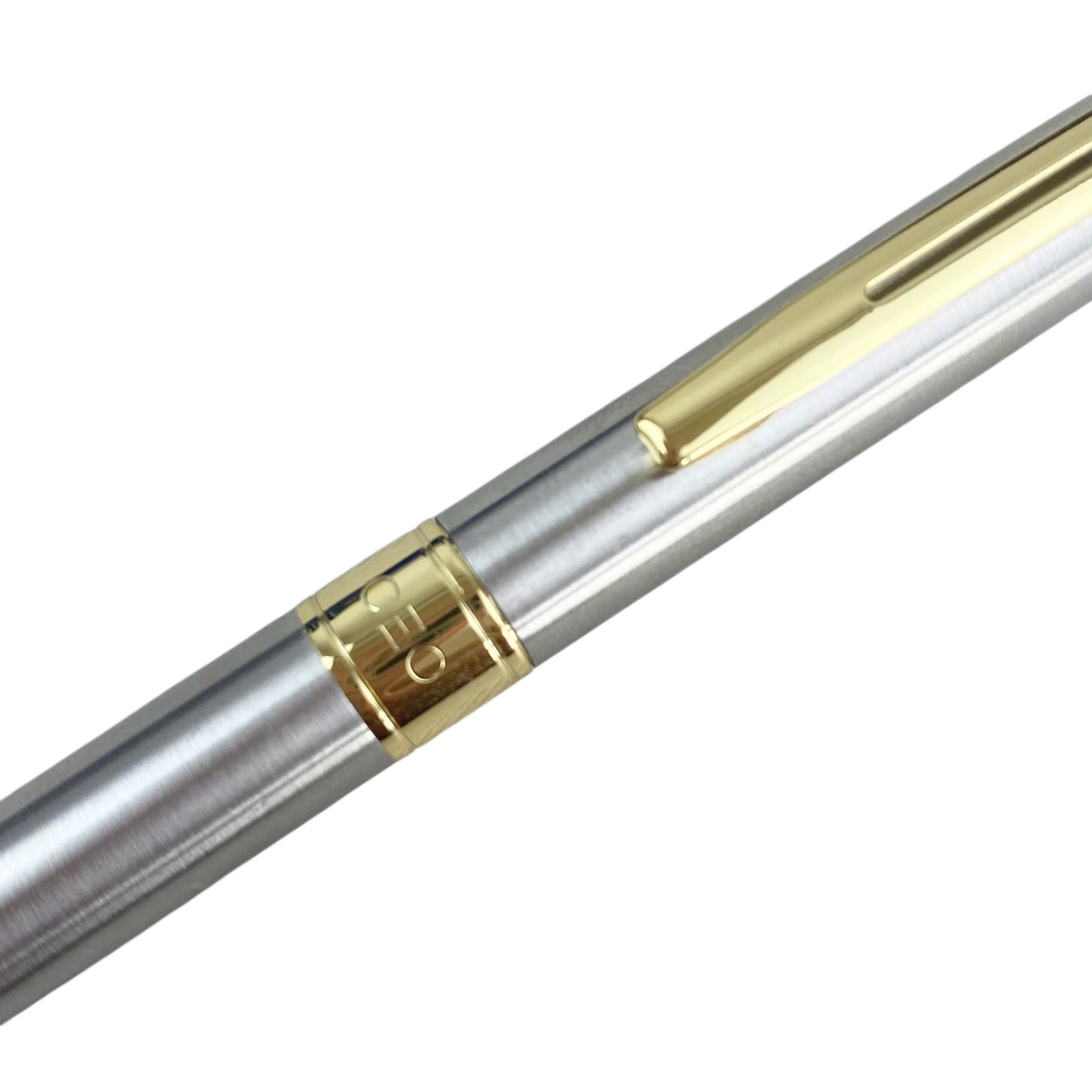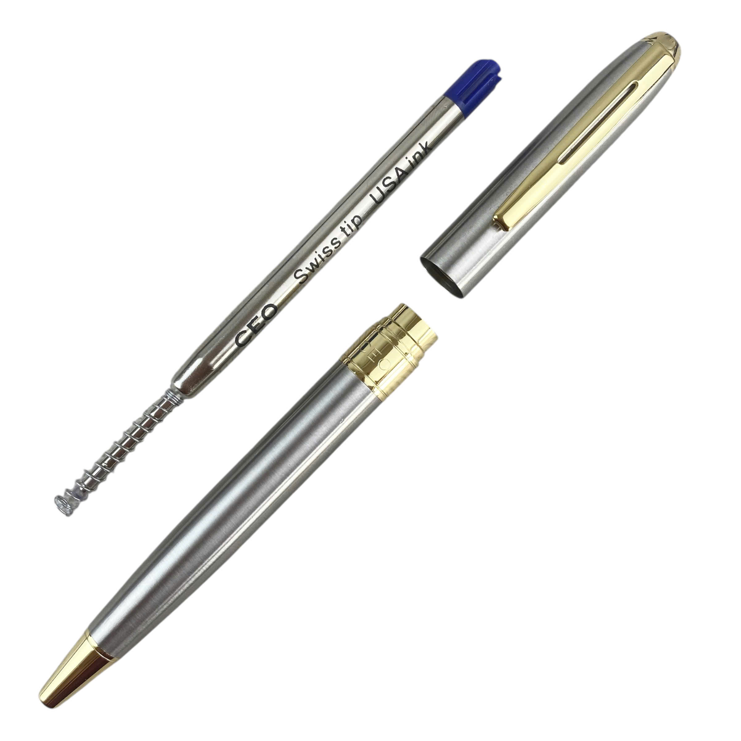 Được làm bằng inox sơn vàng, mạ đen sáng bóng ở đuôi của bút, phần đai được khắc một chữ CEO của thương hiệu để tạo nên điểm nhấn độc đáo, thân bút xoay dễ dàng vặn ngòi bút ra.