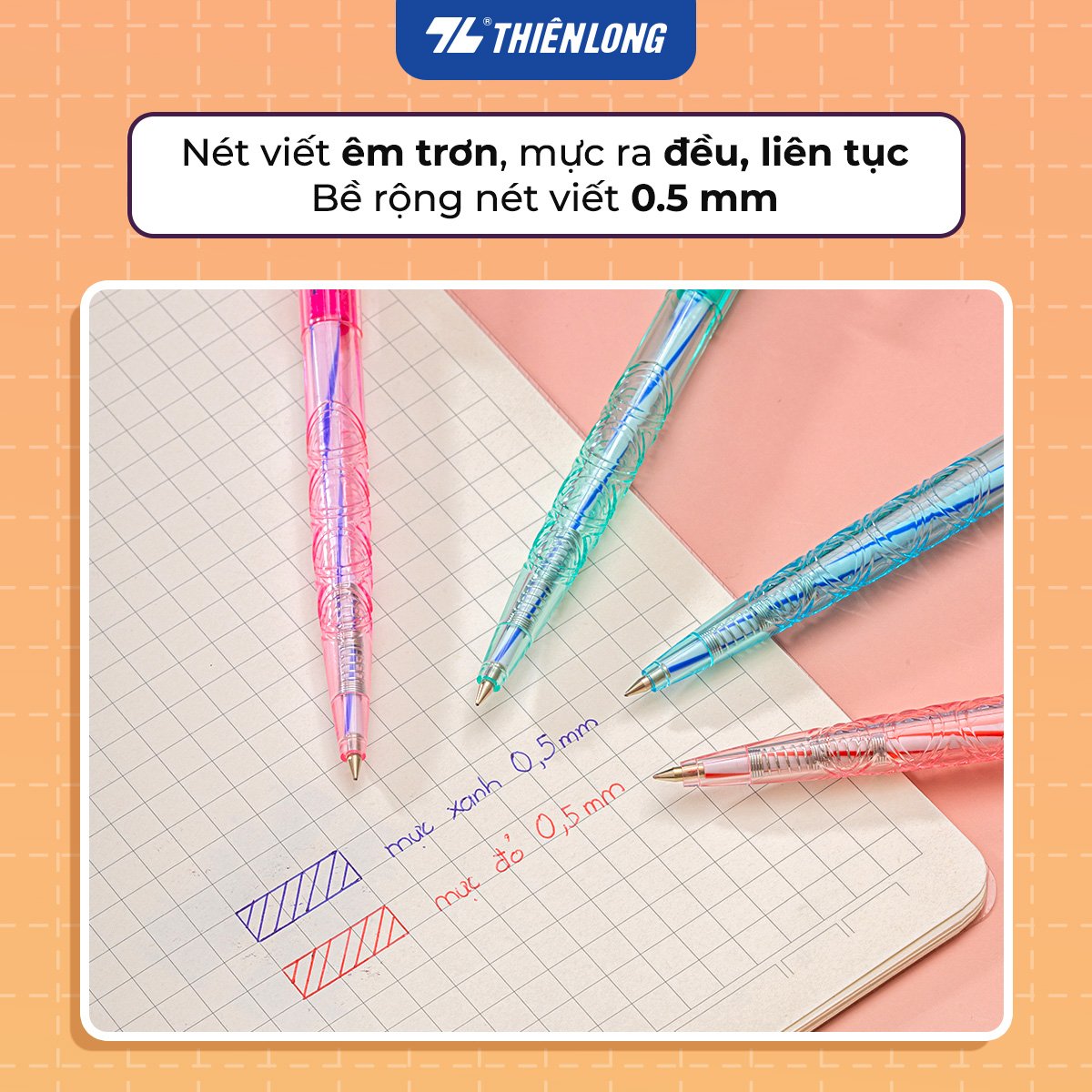 Thân bút làm từ nhựa trong pha màu nhạt, nhìn được phần ruột bút bên trong.