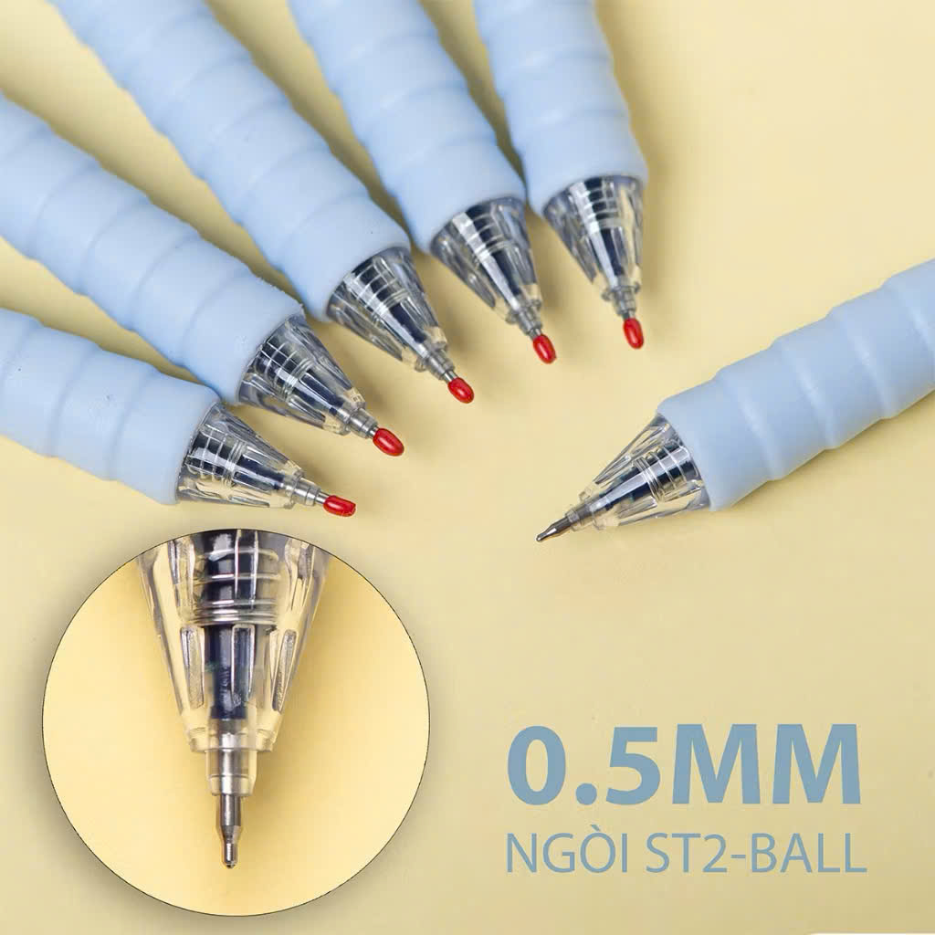 Bút sử dụng loại mực cao cấp có hương thơm hoa quả, màu sắc tươi sáng và chóng thấm nước. Kết hợp cùng đầu bút có 2 bi 0.5mm siêu bền, viết êm cho nét mực mượt mà, thanh mảnh phù hợp cho học sinh, sinh viên dùng để viết, rèn luyện chữ,...