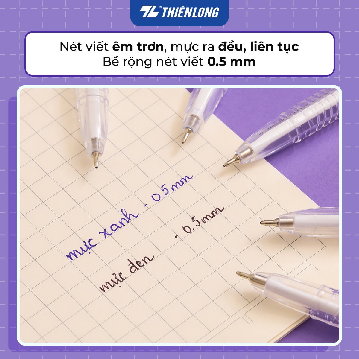 Bút có ngòi 0.5mm, cho nét viết mảnh, nhỏ, mực ra đều, không lem và nhanh khô. Đầu bút êm, viết trơn, nét mực tươi sáng phù hợp cho học sinh, sinh viên dùng để viết, ghi chép,...
