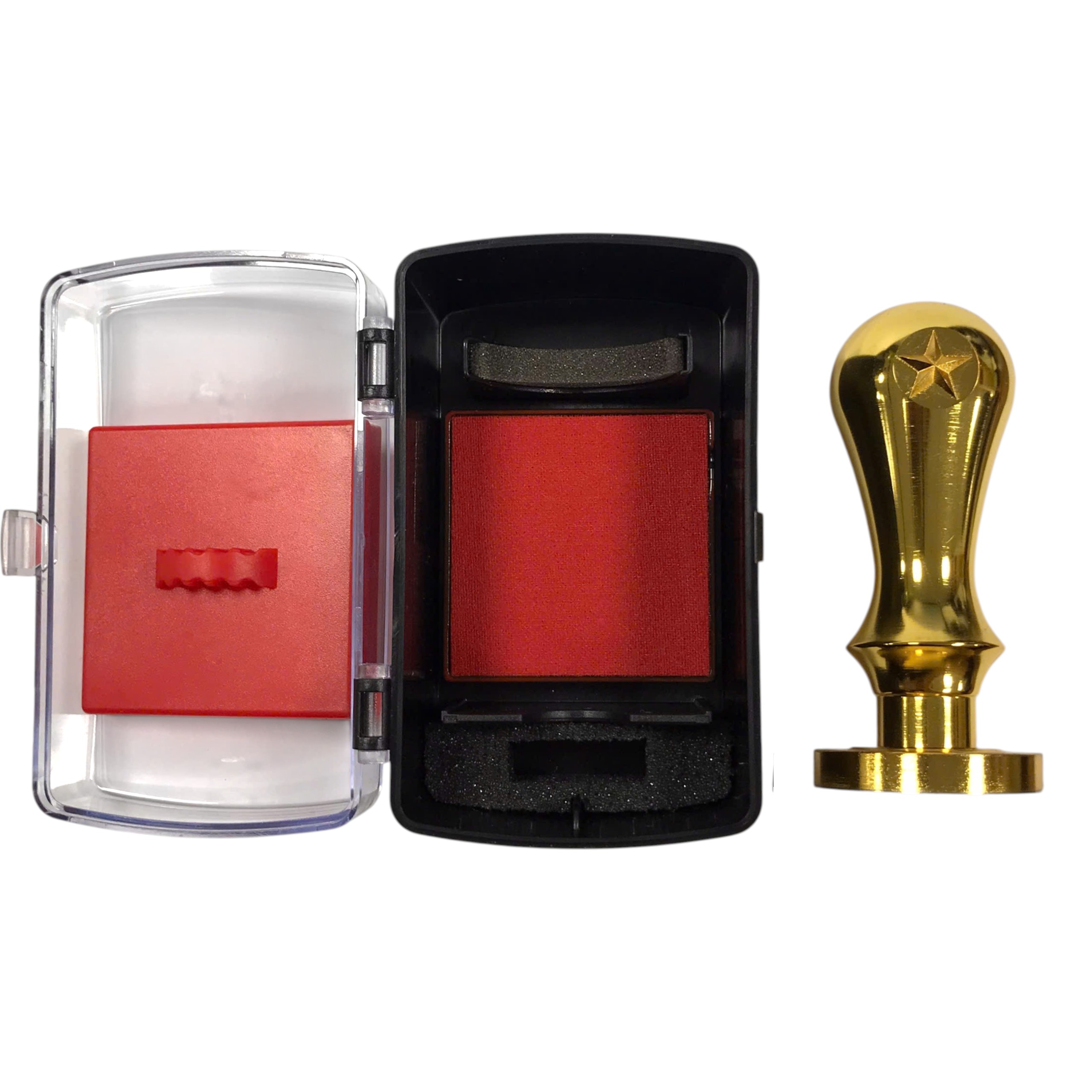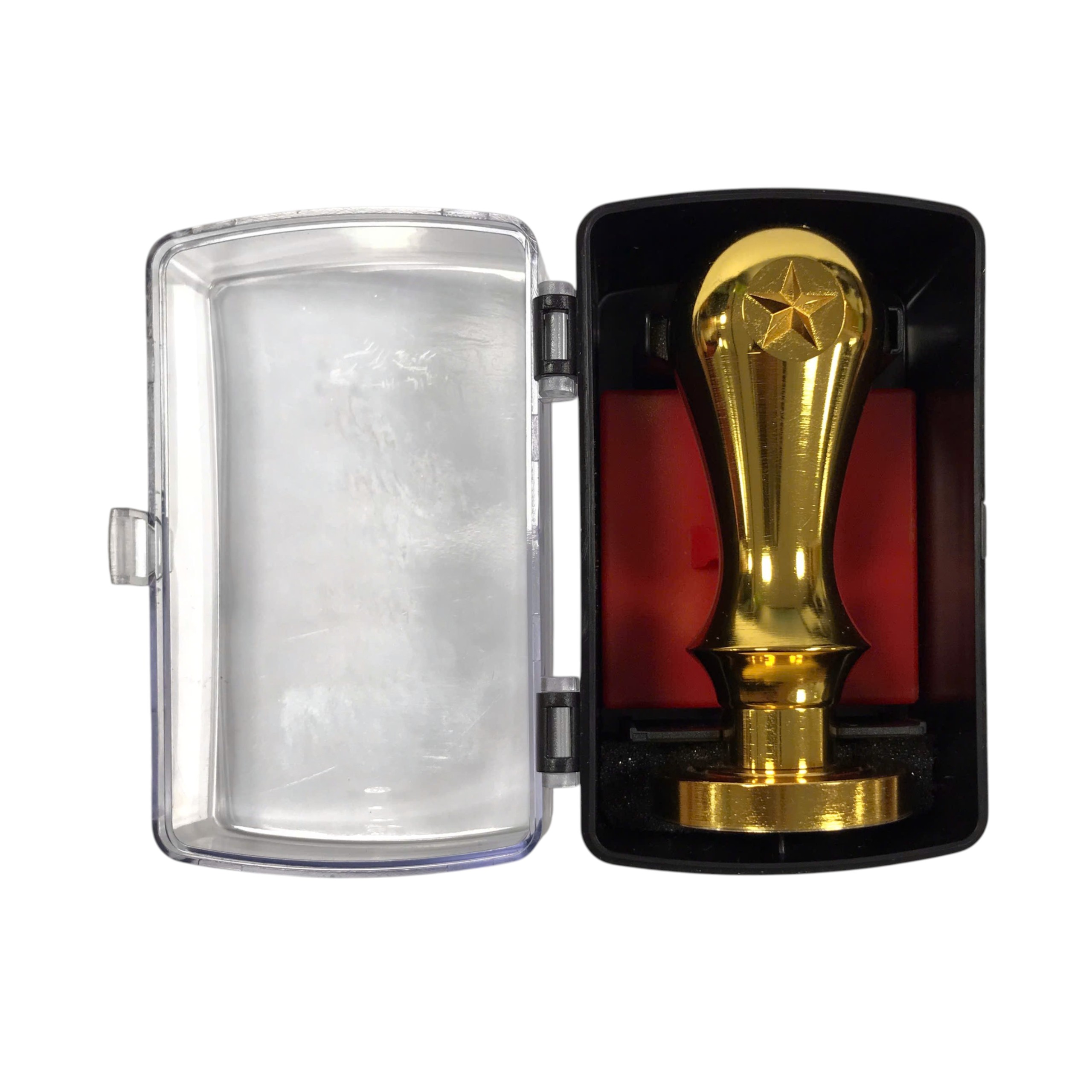 Cán và mặt dấu được làm bằng đồng nguyên khối, bề mặt xi 24k, kèm tampon mực đỏ.