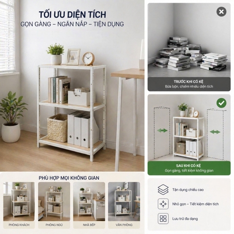 Kệ giúp tận dụng không gian theo chiều dọc, đặc biệt phù hợp với phòng nhỏ, căn hộ mini hoặc góc làm việc có diện tích hạn chế. Nhờ thiết kế thông minh, bạn có thể lưu trữ được nhiều đồ hơn mà vẫn giữ không gian gọn gàng, thoáng đãng.
