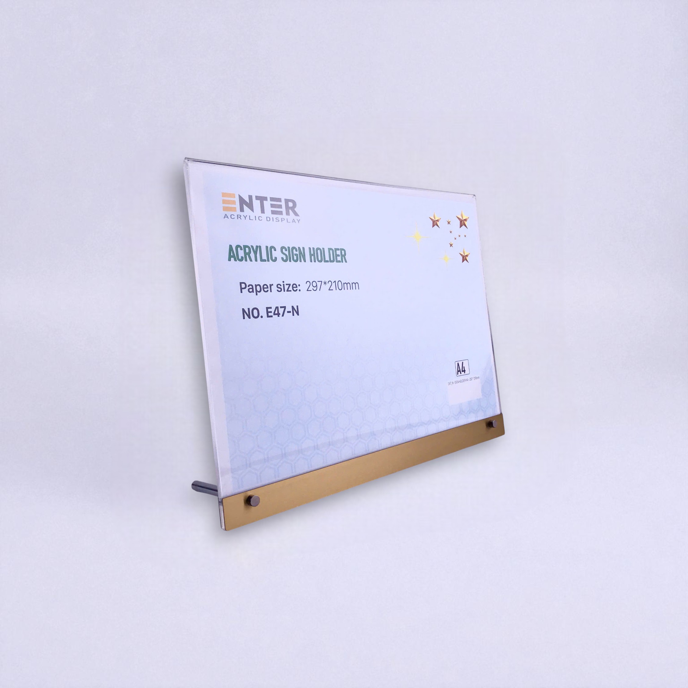 Kệ mica 1 mặt Enter liên kết bulon để bàn là sản phẩm làm từ Mica Đài Loan, điểm nhấn nổi bật là đường viền kim loại màu vàng sang trọng, tạo nét thẩm mỹ hiện đại và thu hút, thích hợp dùng để tranh ảnh, bằng khen, catalog quảng cáo... sản phẩm này còn được dùng như một standee để bàn quảng cáo sản phẩm một cách ấn tượng nhất.