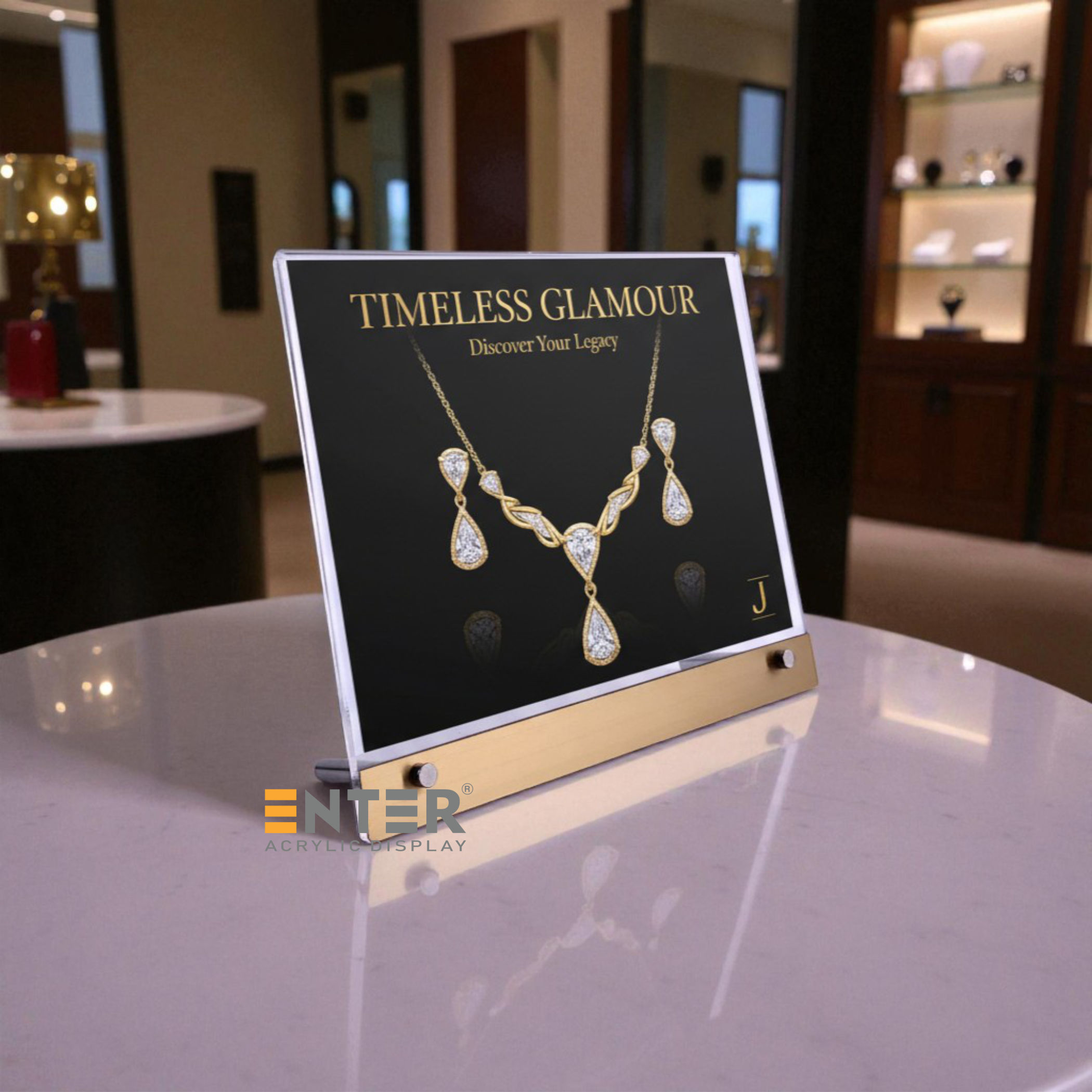 Kệ mica 1 mặt Enter liên kết bulon để bàn là sản phẩm làm từ Mica Đài Loan, điểm nhấn nổi bật là đường viền kim loại màu vàng sang trọng, tạo nét thẩm mỹ hiện đại và thu hút, thích hợp dùng để tranh ảnh, bằng khen, catalog quảng cáo... sản phẩm này còn được dùng như một standee để bàn quảng cáo sản phẩm một cách ấn tượng nhất.