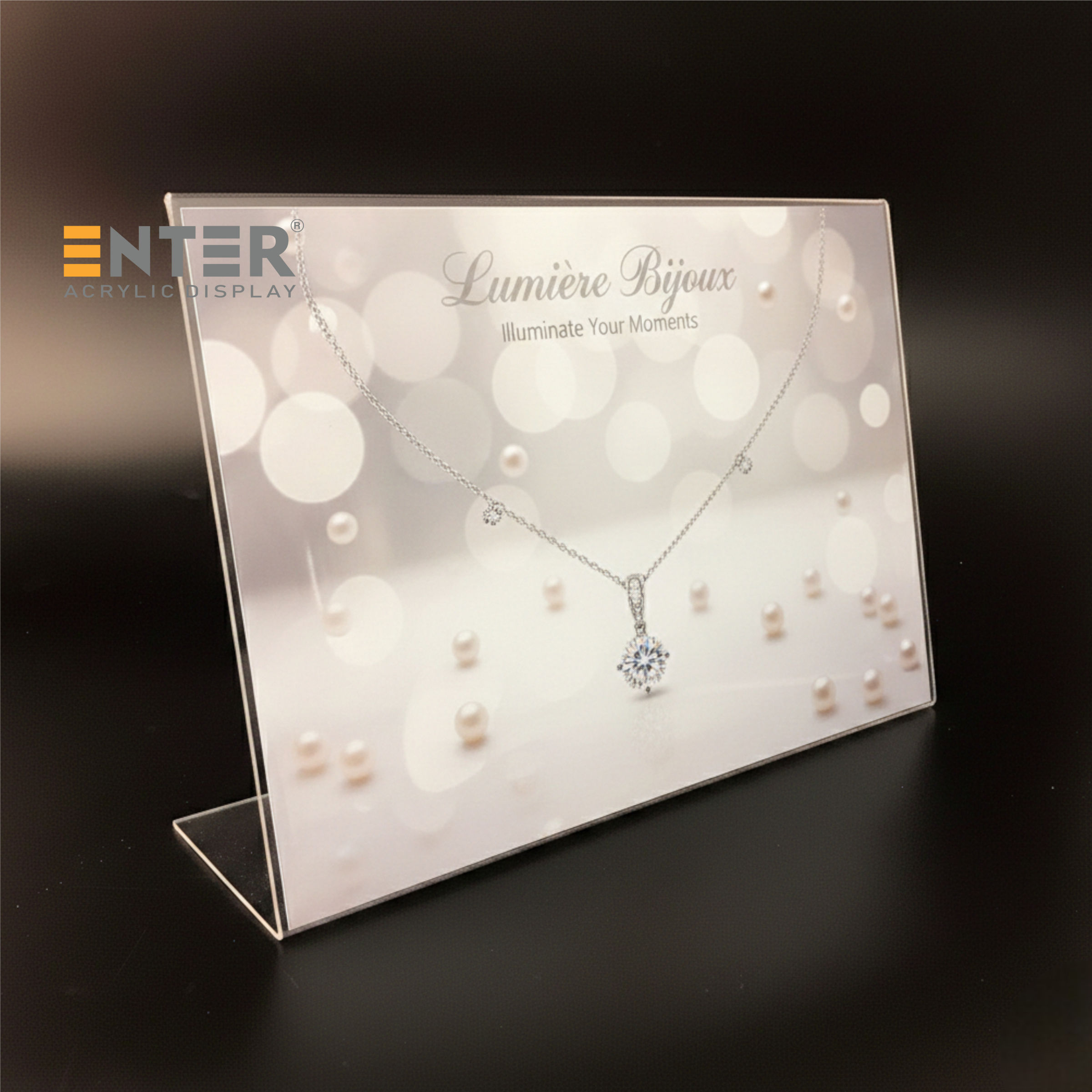 Kệ mica 2 mặt Enter để bàn là sản phẩm làm từ Mica Đài Loan, có công dụng trưng bày thực đơn, hiển thị giá cả sản phẩm tại các nhà hàng, khách sạn... sản phẩm này còn được dùng như một standee để bàn quảng cáo sản phẩm một cách ấn tượng nhất.