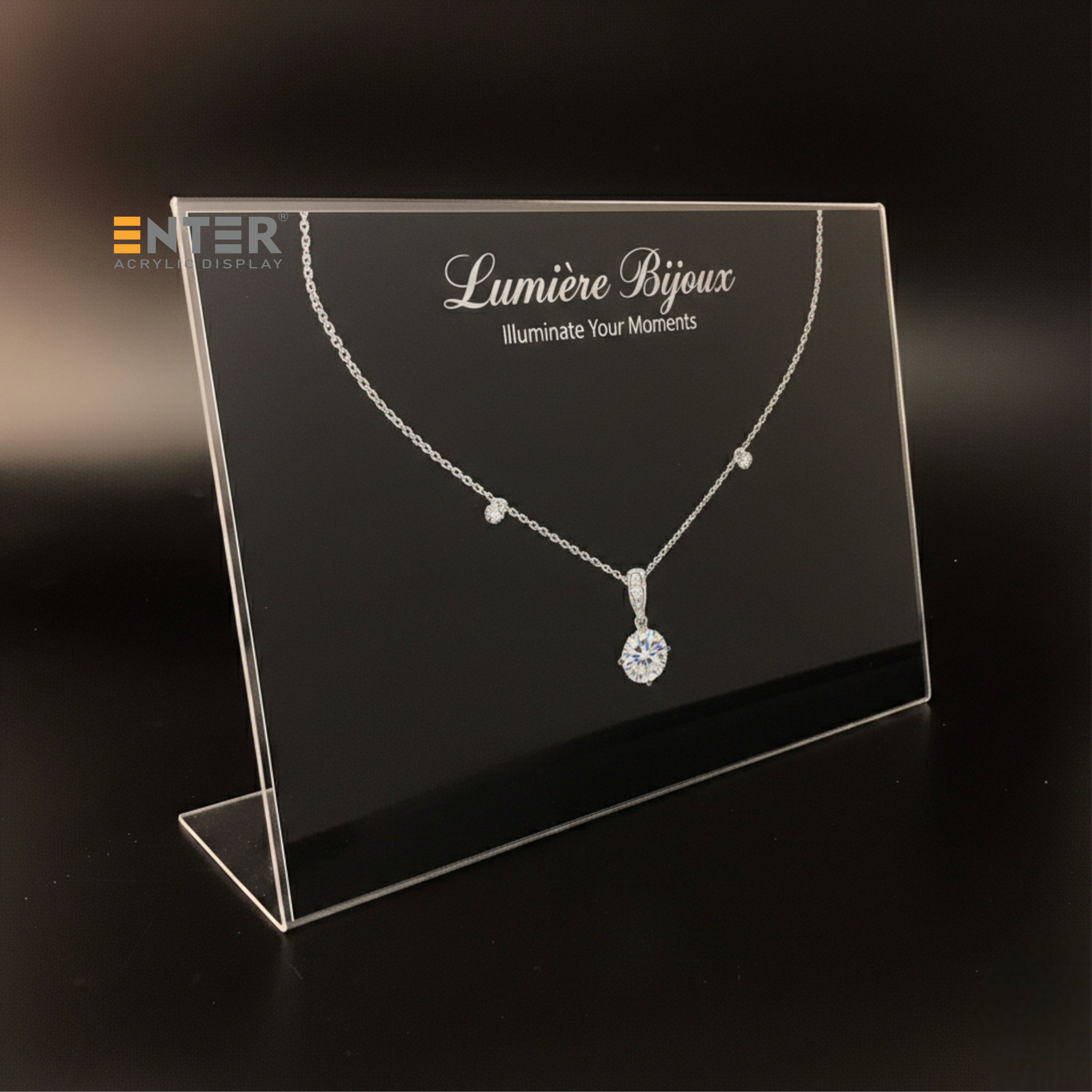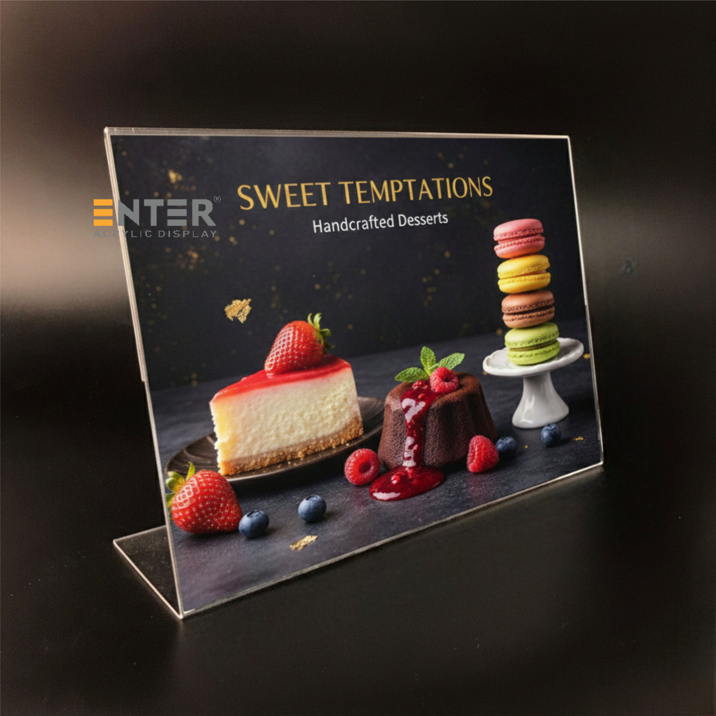 Kệ mica 2 mặt Enter để bàn là sản phẩm làm từ Mica Đài Loan, có công dụng trưng bày thực đơn, hiển thị giá cả sản phẩm tại các nhà hàng, khách sạn... sản phẩm này còn được dùng như một standee để bàn quảng cáo sản phẩm một cách ấn tượng nhất.