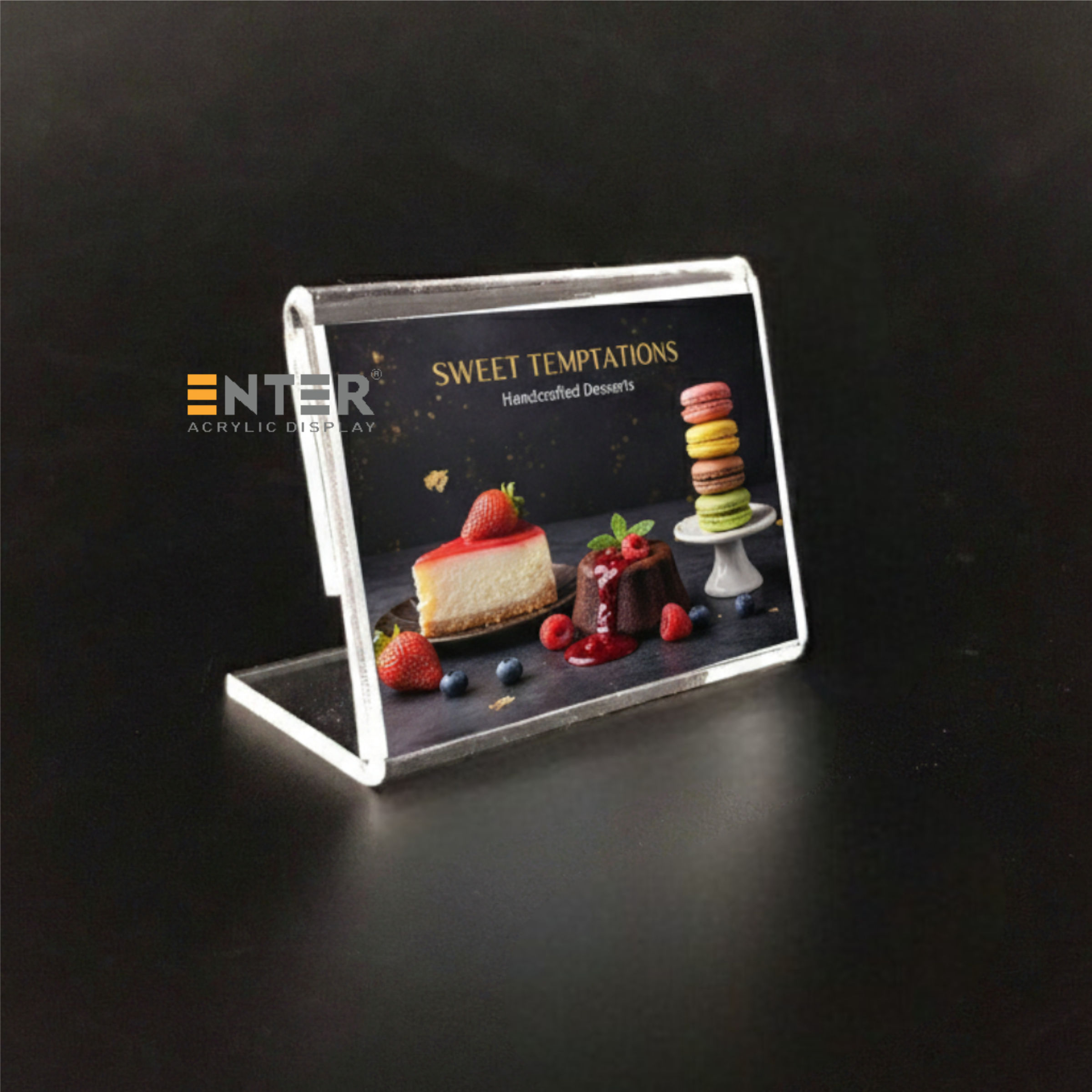 Kệ mica 2 mặt Enter để bàn là sản phẩm làm từ Mica Đài Loan, có công dụng trưng bày thực đơn, hiển thị giá cả sản phẩm tại các nhà hàng, khách sạn... sản phẩm này còn được dùng như một standee để bàn quảng cáo sản phẩm một cách ấn tượng nhất.