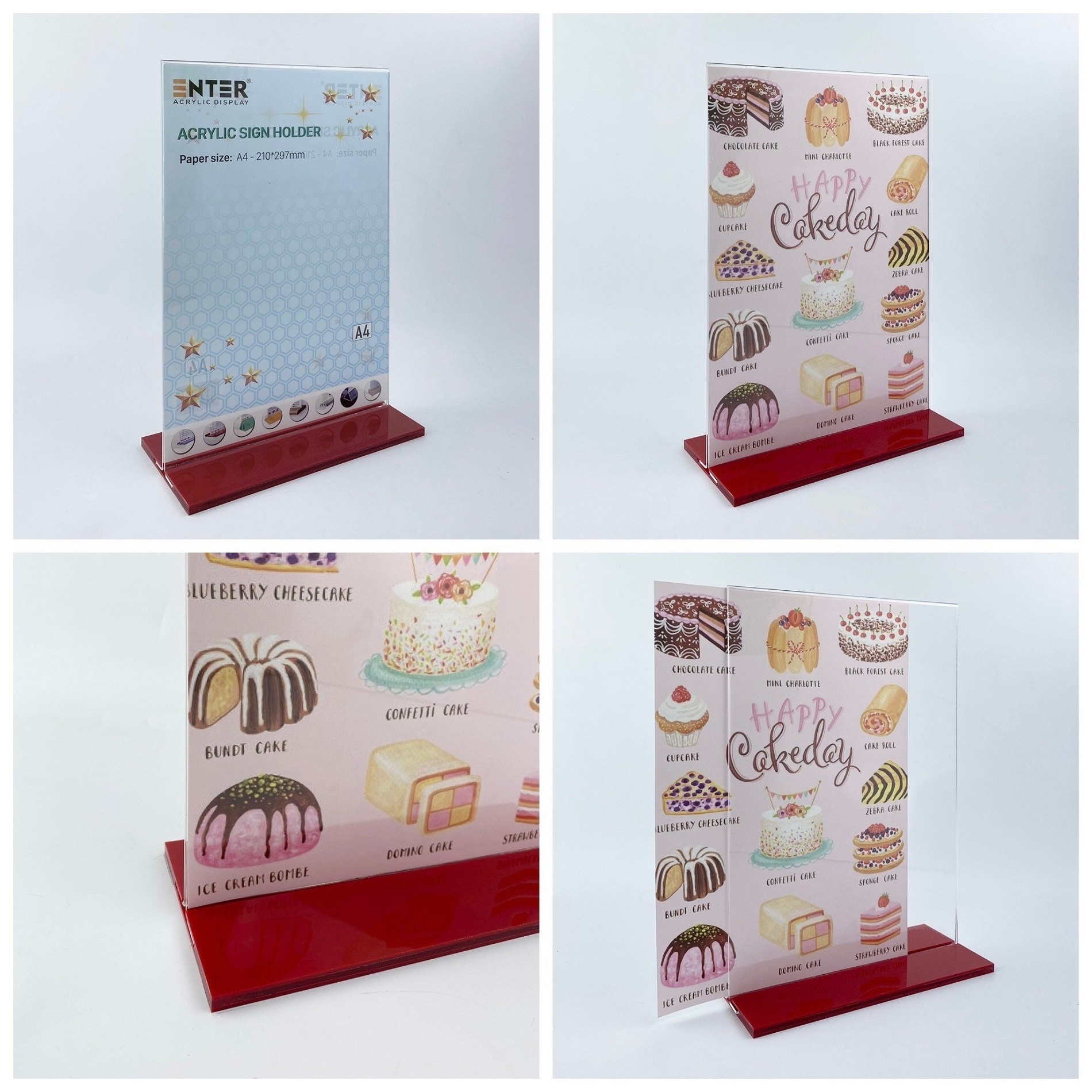 Kệ mica 2 mặt Enter đế lùa sở hữu thiết kế đơn giản nhưng tiện dụng, mang lại hiệu quả cao trong việc trưng bày, quảng cáo và tăng tính thẩm mỹ cho không gian. Thân kệ được làm từ mica trong suốt chất lượng cao, không bị đục, mờ hay rạn nứt, giúp hiển thị menu rõ ràng từ hai mặt. Đế kệ làm bằng mica với nhiều màu sắc tươi sáng, có thể tháo rời dễ dàng, thuận tiện cho việc thay thế menu hoặc tài liệu quảng cáo. Đây là giải pháp tiết kiệm chi phí hiệu quả mỗi khi cần thay đổi thực đơn hoặc cập nhật thông tin khuyến mãi.