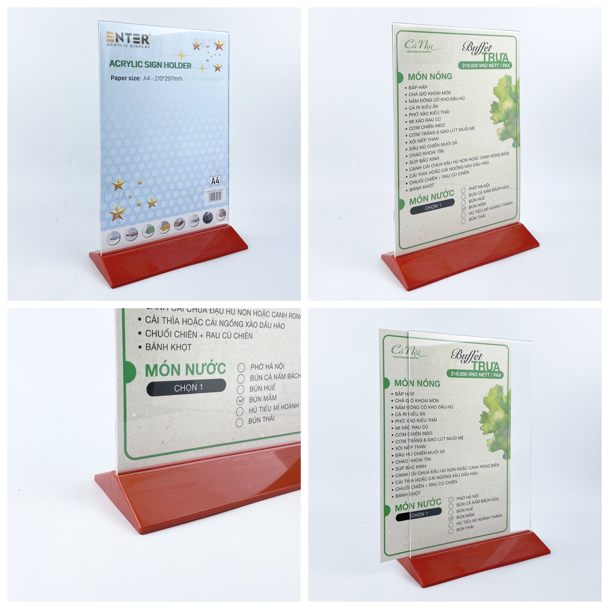 Kệ mica 2 mặt Enter đế màu sở hữu thiết kế đơn giản nhưng tiện dụng, mang lại hiệu quả cao trong việc trưng bày, quảng cáo và tăng tính thẩm mỹ cho không gian. Thân kệ được làm từ mica trong suốt chất lượng cao, không bị đục, mờ hay rạn nứt, giúp hiển thị menu rõ ràng từ hai mặt. Đế làm bằng nhựa ABS có nhiều màu sắc tươi sáng, có thể tháo rời dễ dàng, thuận tiện cho việc thay thế menu hoặc tài liệu quảng cáo. Đây là giải pháp tiết kiệm chi phí hiệu quả mỗi khi cần thay đổi thực đơn hoặc cập nhật thông tin khuyến mãi.