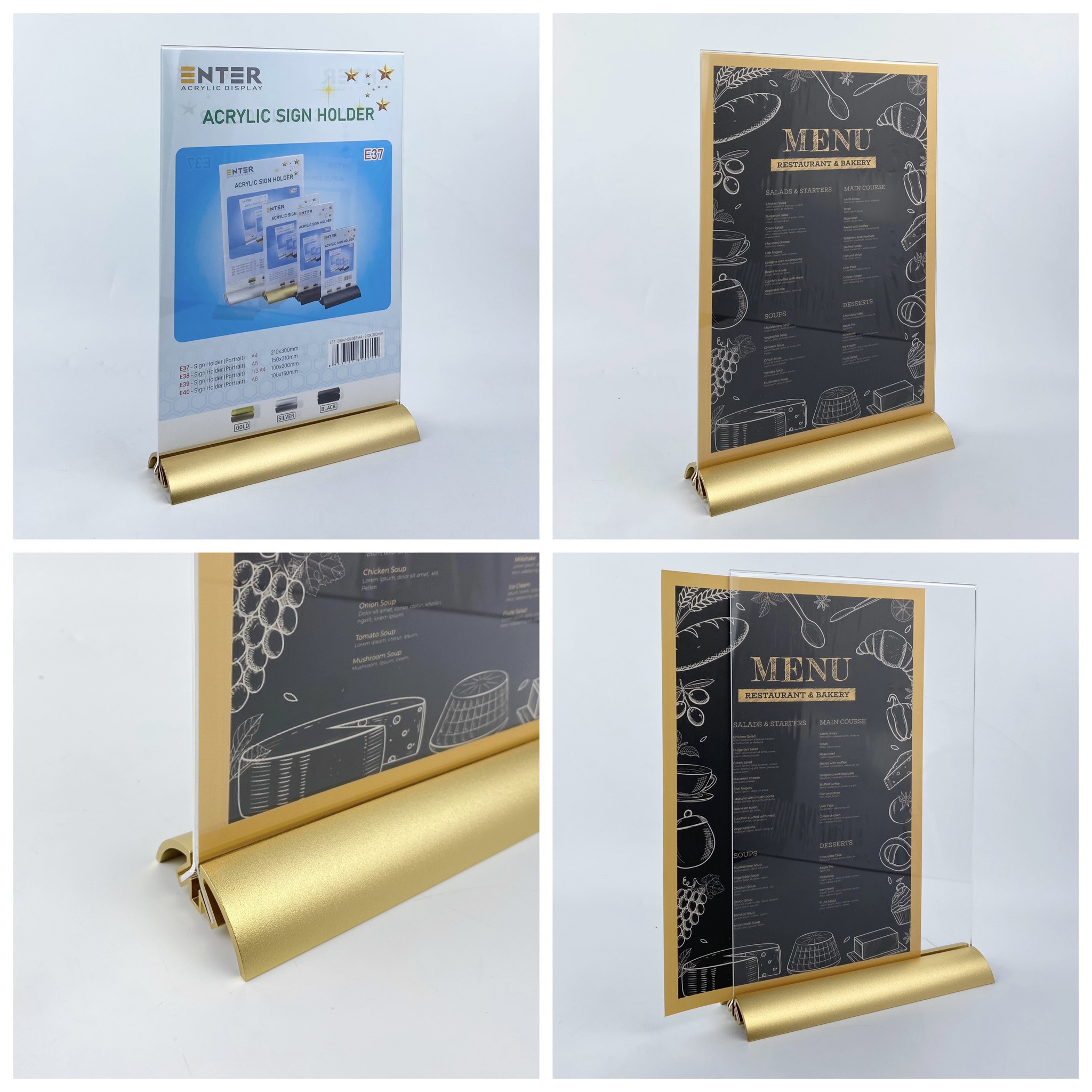Kệ mica 2 mặt Enter đế nhôm cao cấp để bàn là sản phẩm làm từ Mica Đài Loan, có công dụng trưng bày thực đơn, hiển thị giá cả sản phẩm tại các nhà hàng, khách sạn... sản phẩm này còn được dùng như một standee để bàn quảng cáo sản phẩm một cách ấn tượng nhất.