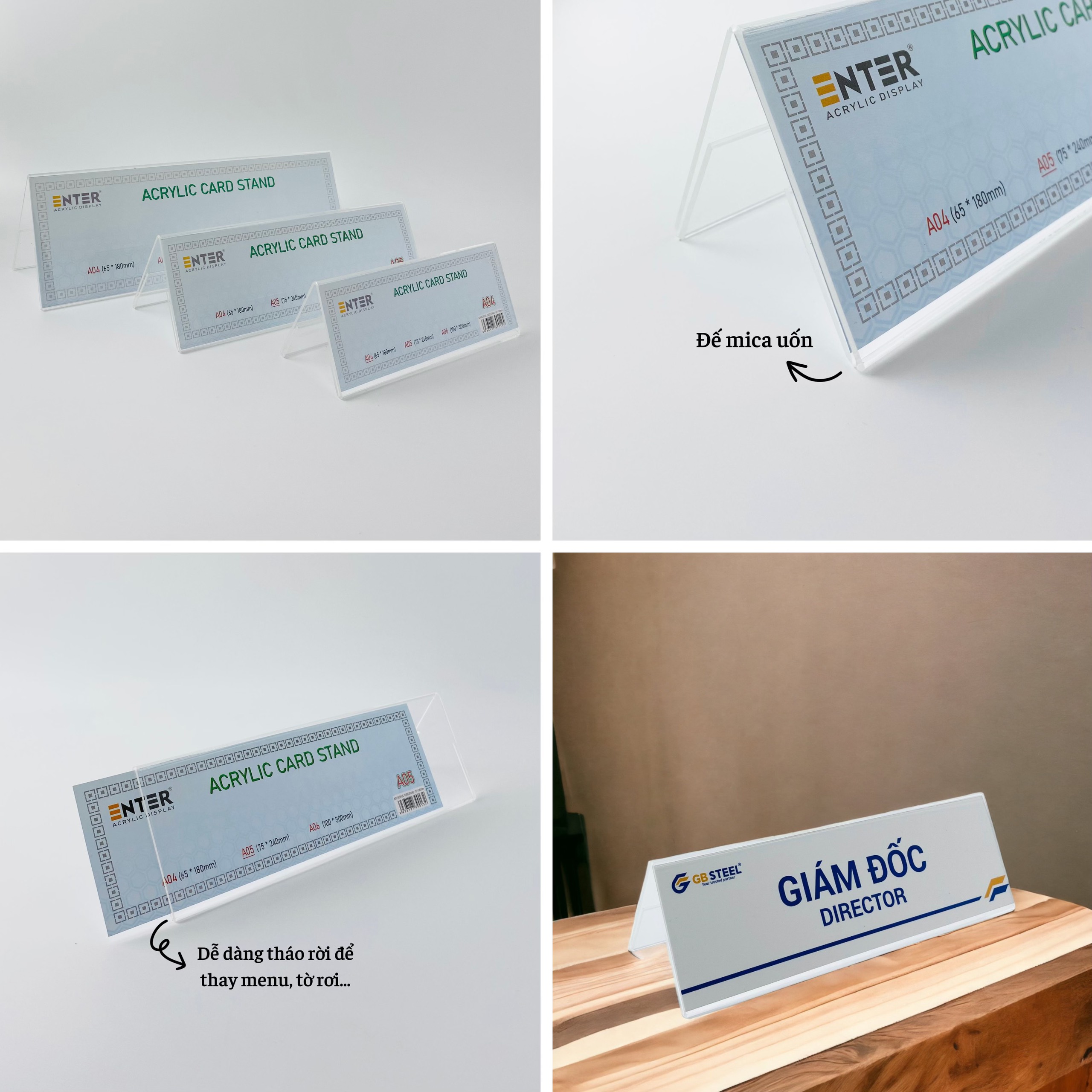 Kệ mica chức vụ 2 mặt Enter sở hữu thiết kế đơn giản nhưng tinh tế, mang lại tính thẩm mỹ cao cho không gian làm việc. Không chỉ tiện lợi trong sử dụng, sản phẩm còn hỗ trợ hiệu quả cho việc quảng bá thương hiệu và truyền tải thông tin, góp phần nâng cao hình ảnh chuyên nghiệp của cá nhân hoặc tổ chức. Thân kệ được làm từ mica trong suốt chất lượng cao, không bị đục, mờ hay rạn nứt theo thời gian, giúp thông tin chức danh hiển thị rõ ràng, dễ nhìn ở mọi góc độ. Đặc biệt, thiết kế dễ dàng thay đổi nội dung, giúp tiết kiệm chi phí mỗi khi cần cập nhật thông tin chức vụ hay tên người sử dụng.