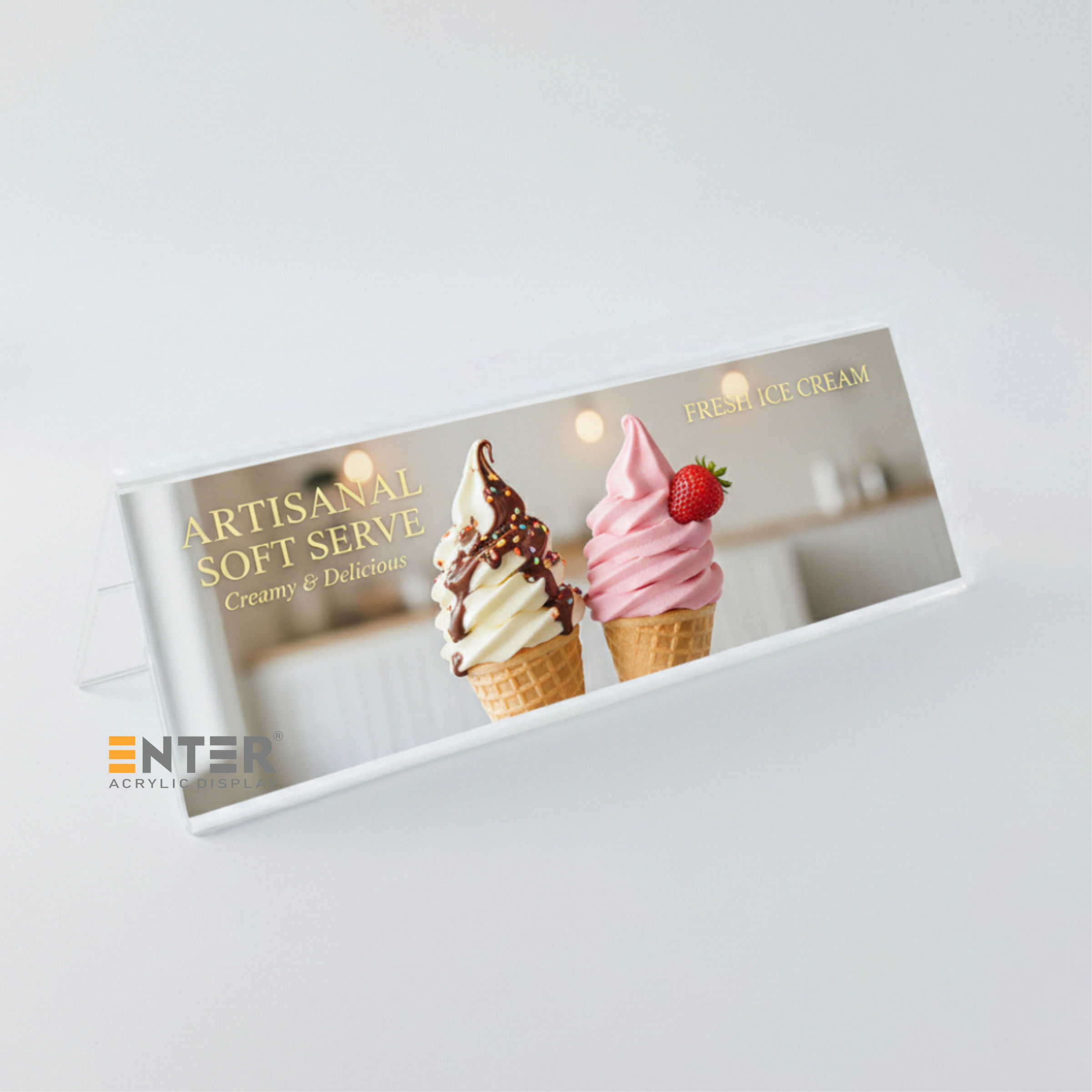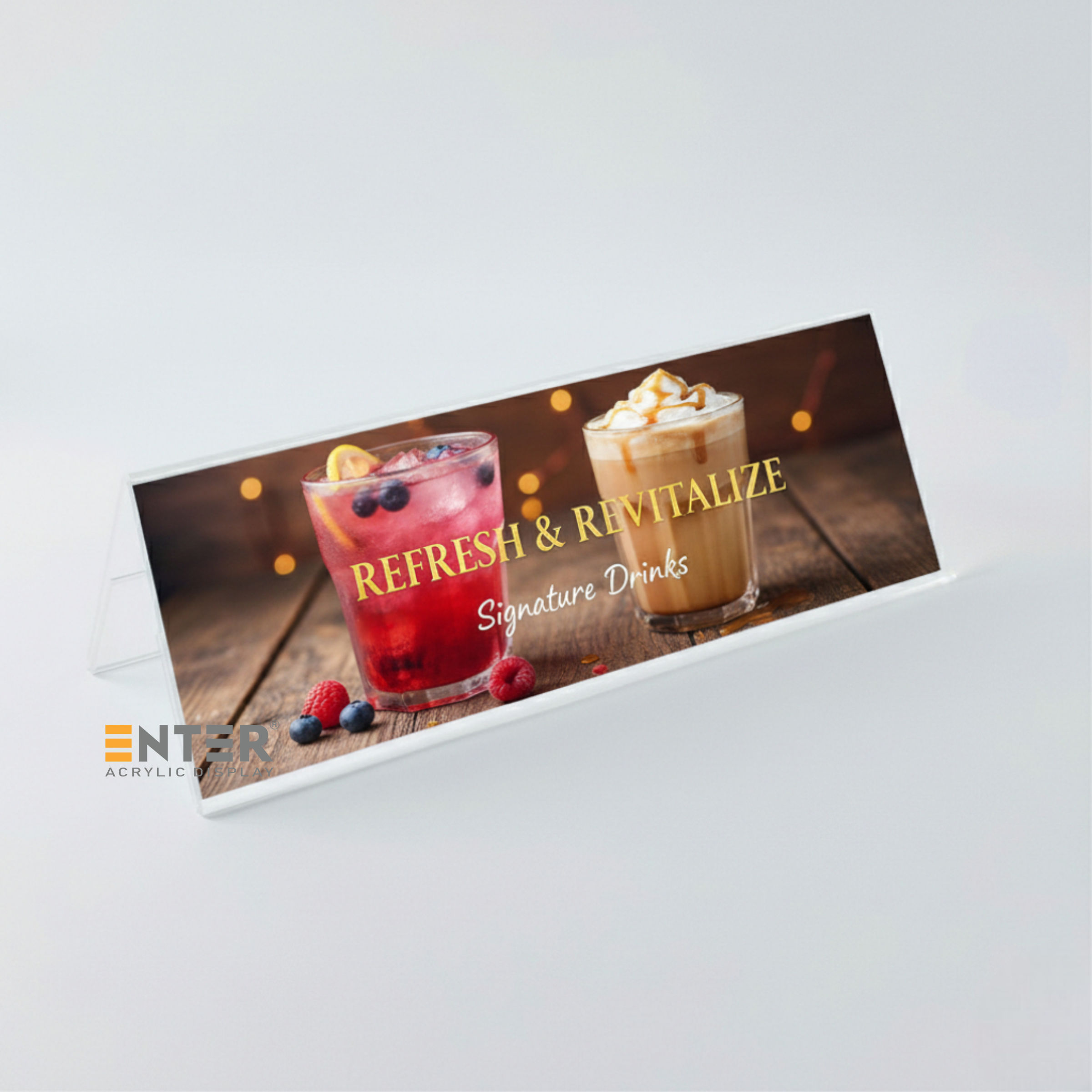 Kệ mica chức vụ 2 mặt Enter để bàn được làm từ mica cao cấp Đài Loan, có độ trong suốt cao, bền đẹp theo thời gian. Sản phẩm được thiết kế nhằm hiển thị rõ ràng tên và chức vụ của cá nhân hoặc đại diện tập thể, giúp nâng cao tính chuyên nghiệp trong môi trường làm việc. Kệ thường được sử dụng phổ biến tại văn phòng doanh nghiệp, cơ quan hành chính cũng như trong các sự kiện như hội nghị, cuộc họp, khu vực tiếp tân, lễ ký kết...