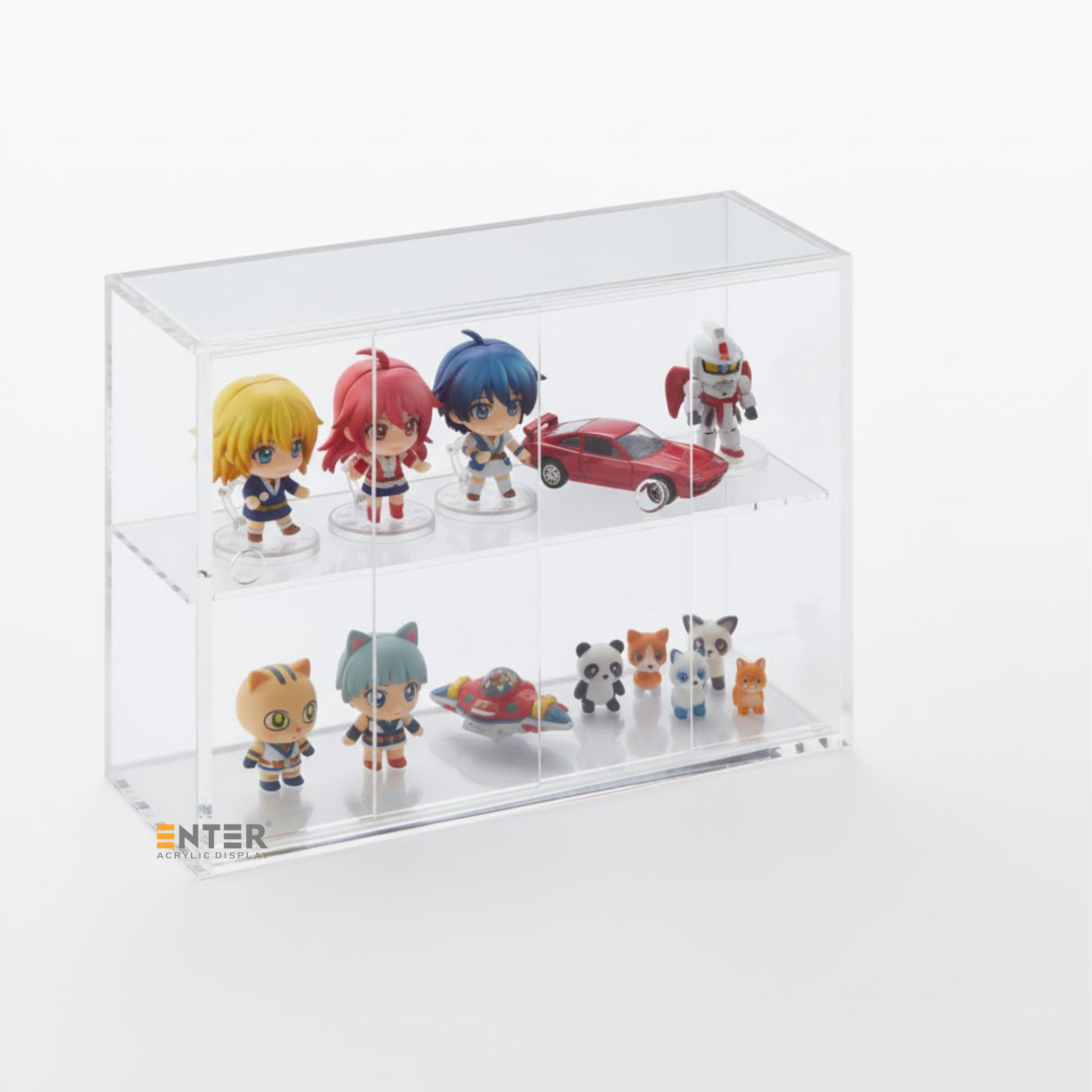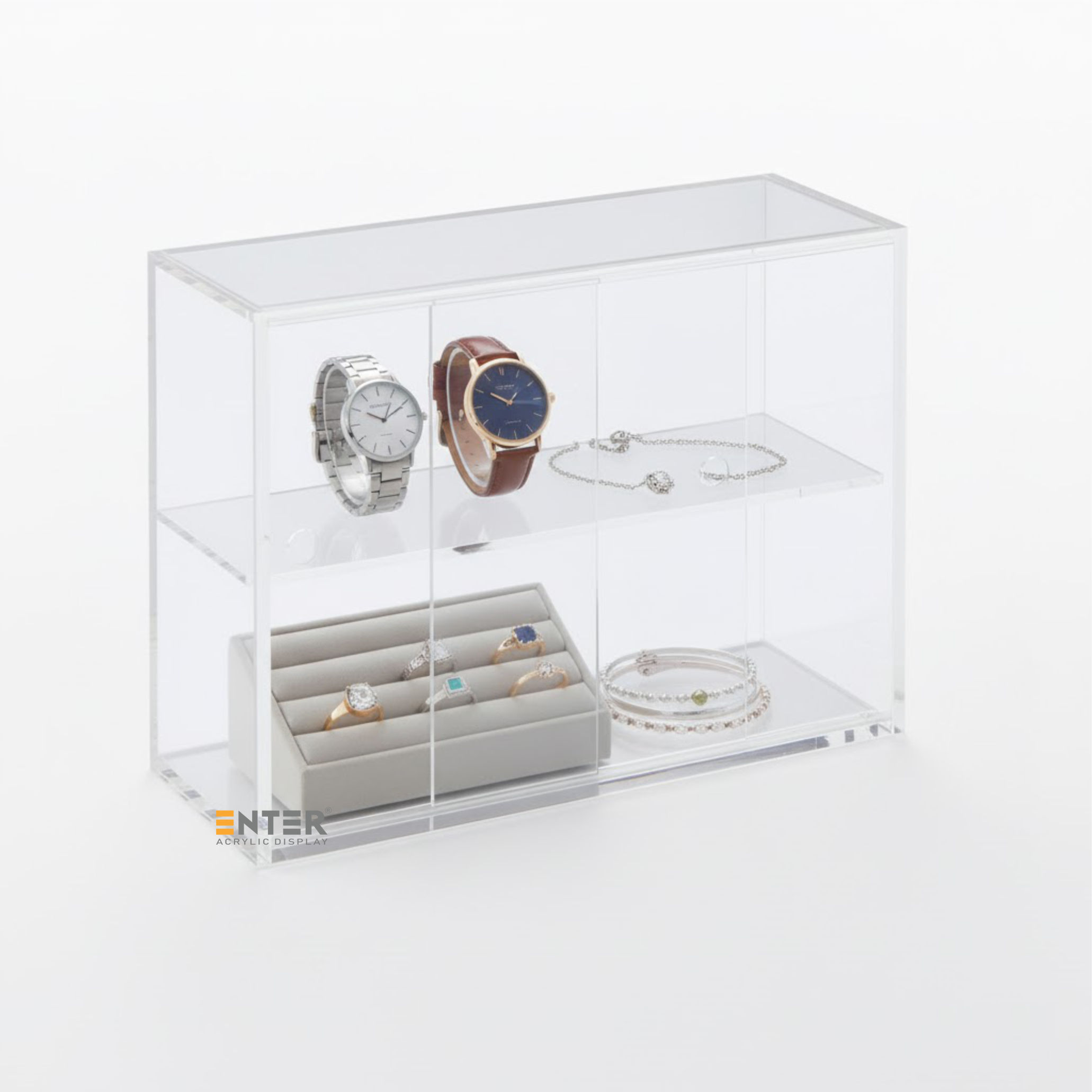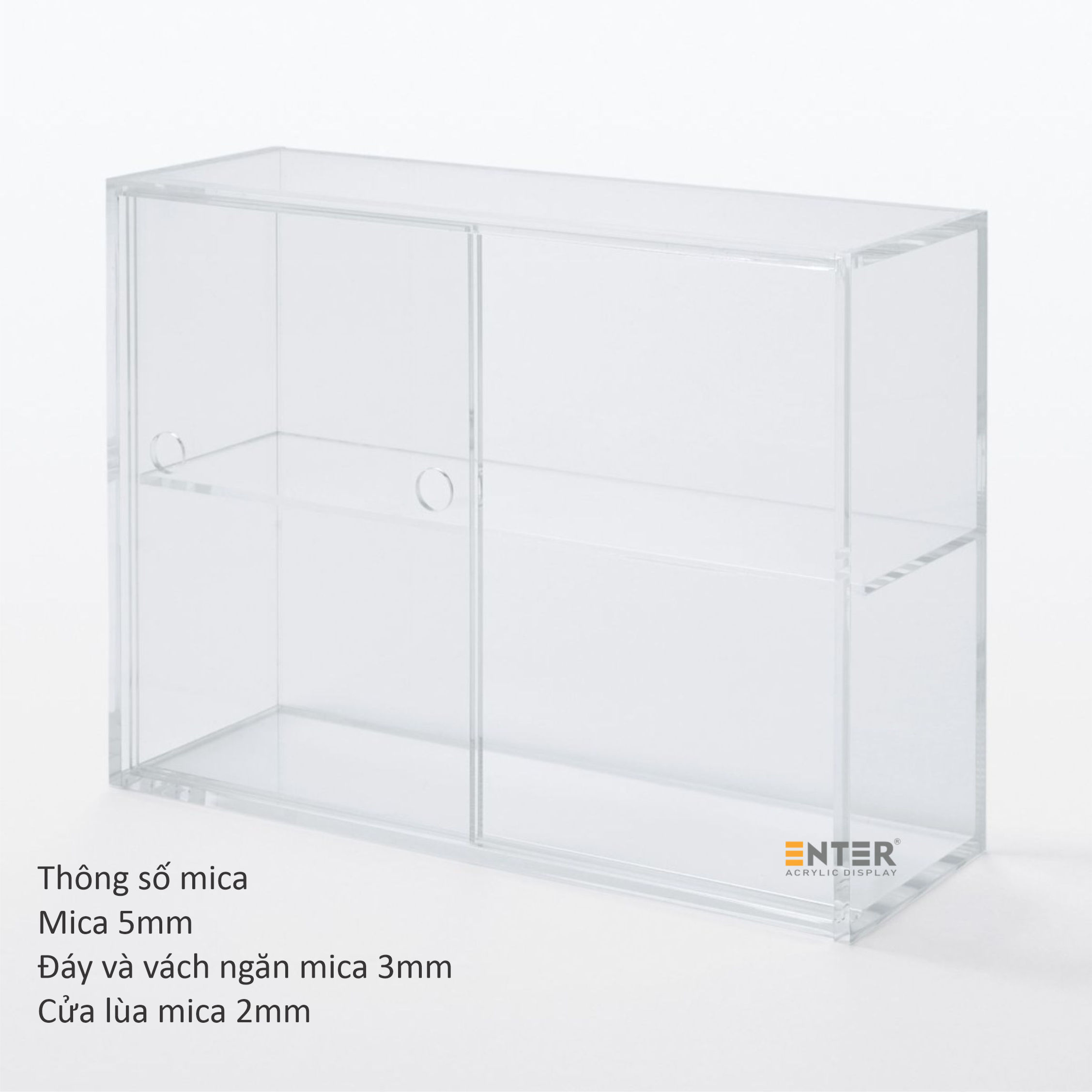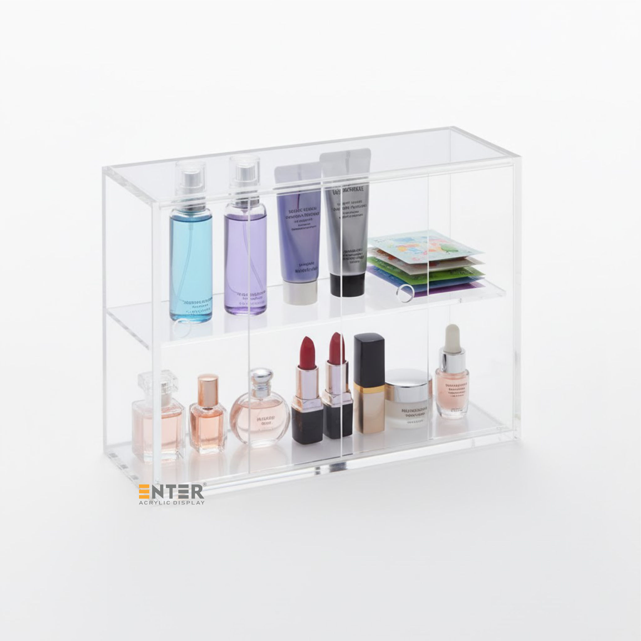 Kệ trưng bày mica Enter TB701 giúp sắp xếp và trưng bày các vật dụng nhỏ một cách gọn gàng, thẩm mỹ. Với thiết kế 2 tầng và cửa lùa tiện lợi, kệ phù hợp để trưng bày mỹ phẩm, phụ kiện, đồ lưu niệm, đồ handmade, đồ chơi mini... tại cửa hàng hoặc ngay trong không gian sống cá nhân. Nhờ chất liệu mica trong suốt, sản phẩm được hiển thị rõ ràng, dễ thu hút ánh nhìn, hỗ trợ tốt cho hoạt động quảng bá, bán hàng cũng như tạo điểm nhấn trang trí tinh tế cho bàn làm việc, bàn trang điểm hoặc kệ sách tại nhà.
