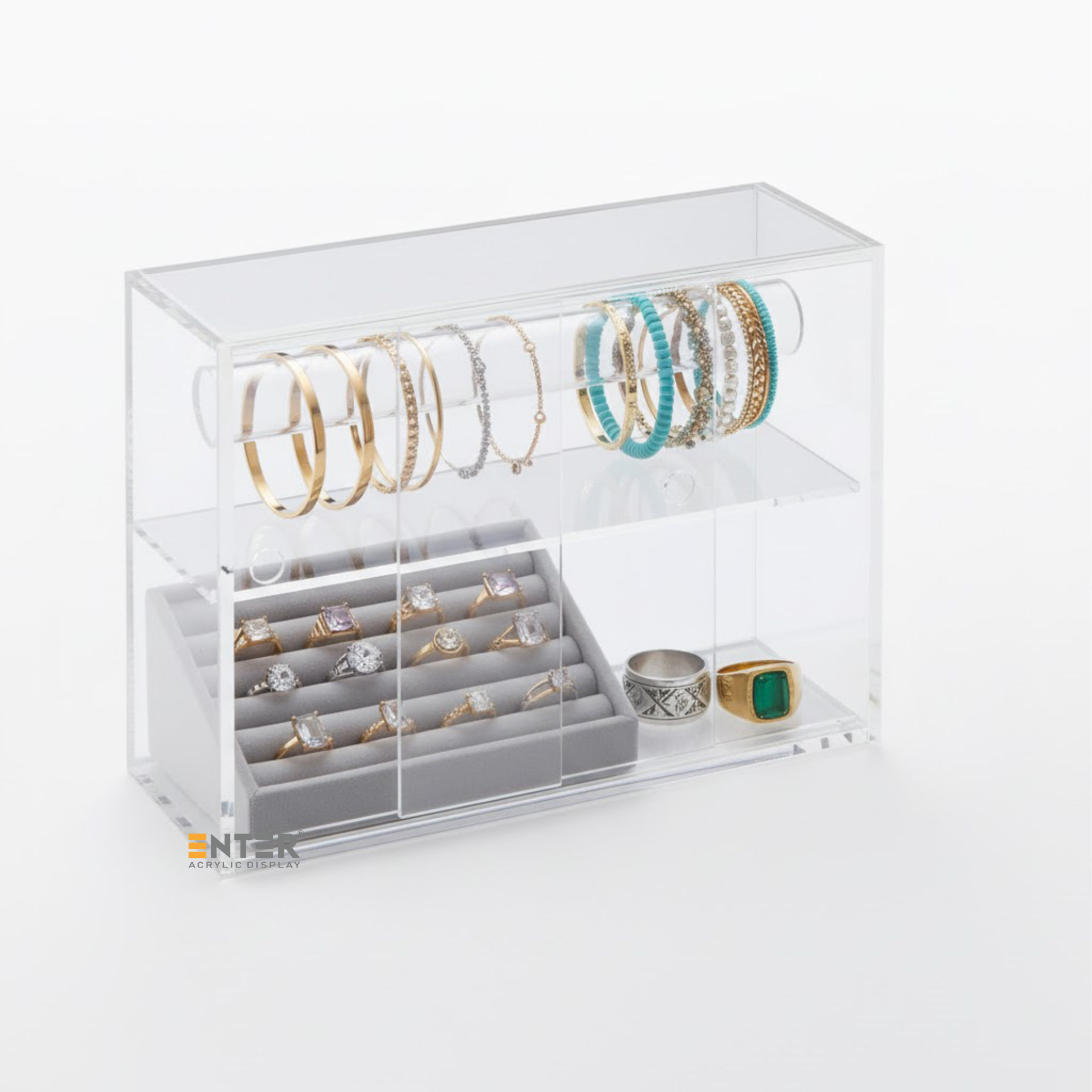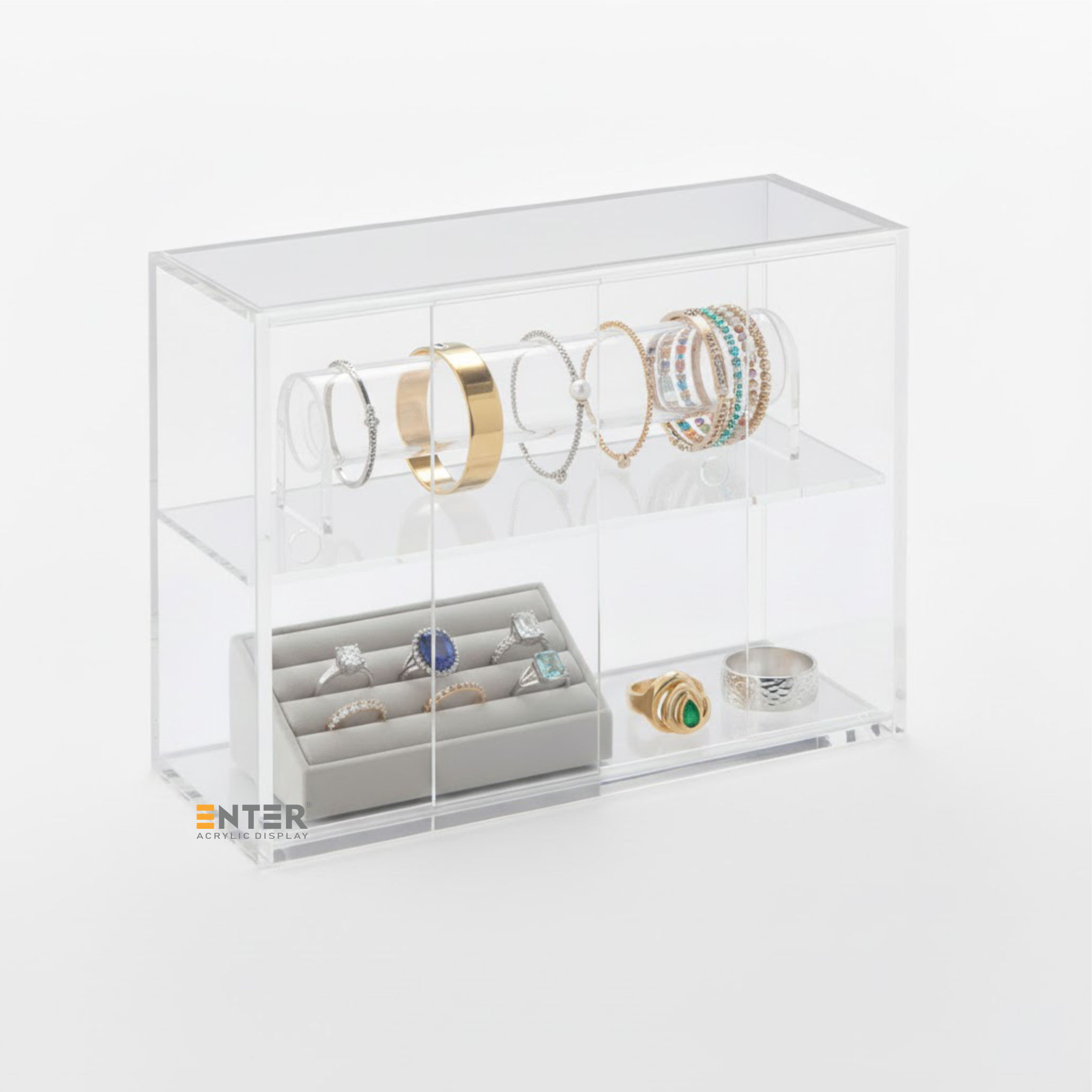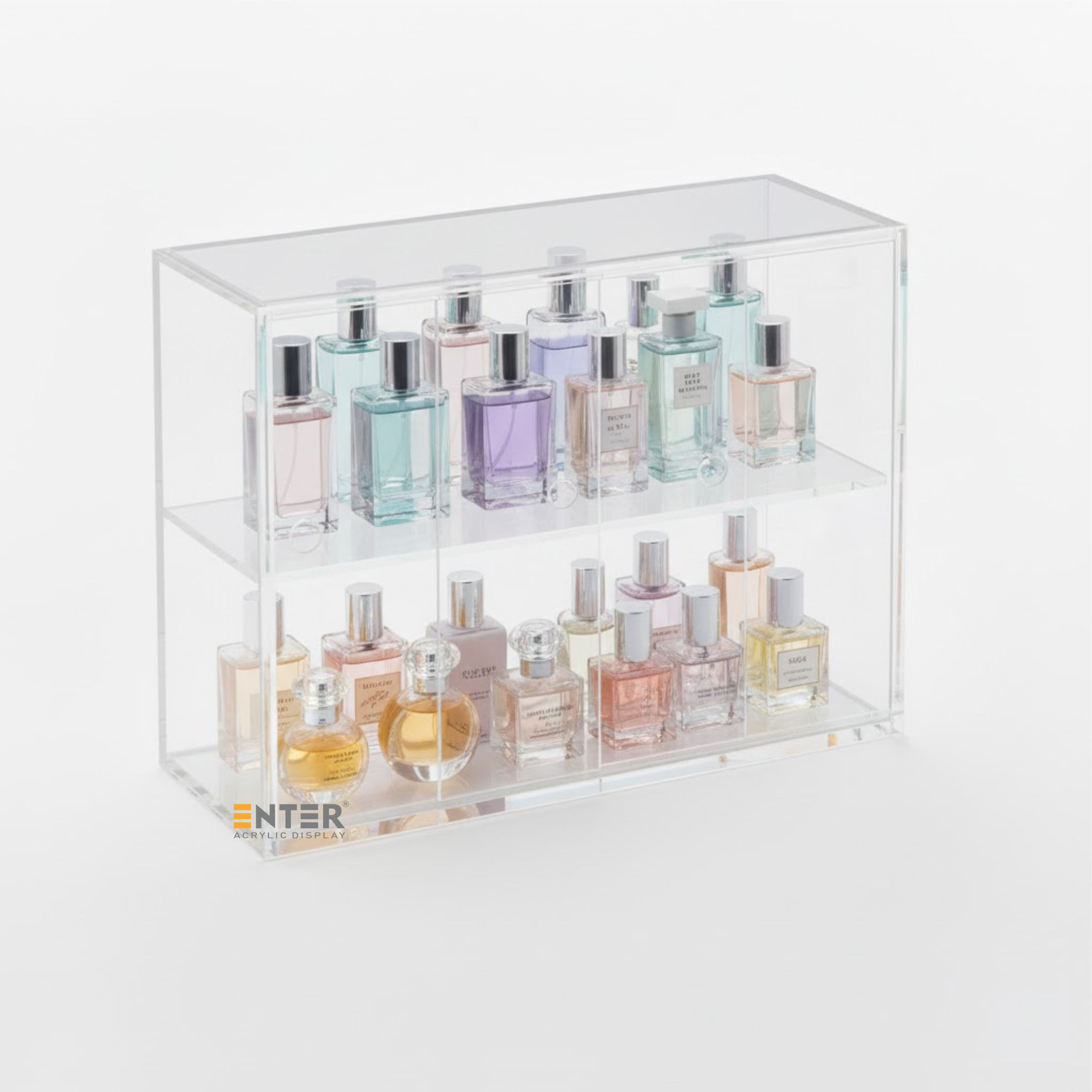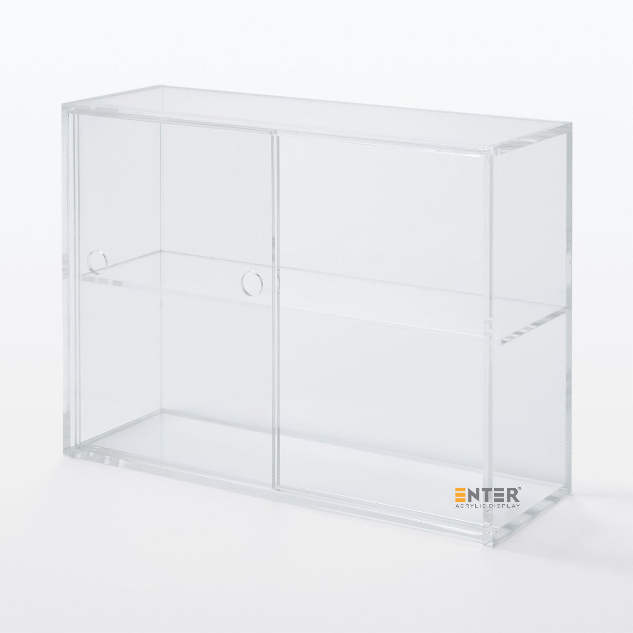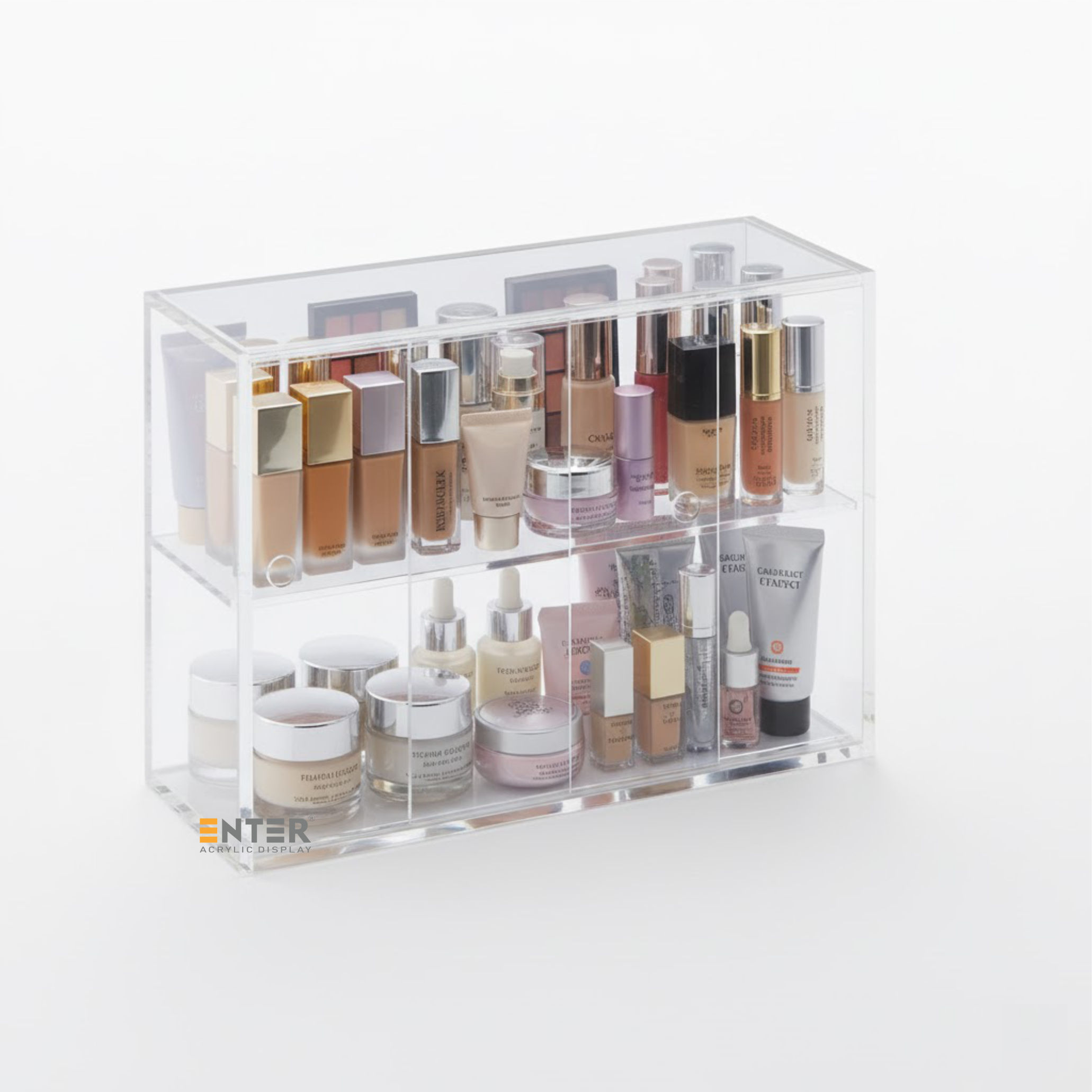 Kệ trưng bày mica Enter TB701 giúp sắp xếp và trưng bày các vật dụng nhỏ một cách gọn gàng, thẩm mỹ. Với thiết kế 2 tầng và cửa lùa tiện lợi, kệ phù hợp để trưng bày mỹ phẩm, phụ kiện, đồ lưu niệm, đồ handmade, đồ chơi mini... tại cửa hàng hoặc ngay trong không gian sống cá nhân. Nhờ chất liệu mica trong suốt, sản phẩm được hiển thị rõ ràng, dễ thu hút ánh nhìn, hỗ trợ tốt cho hoạt động quảng bá, bán hàng cũng như tạo điểm nhấn trang trí tinh tế cho bàn làm việc, bàn trang điểm hoặc kệ sách tại nhà.