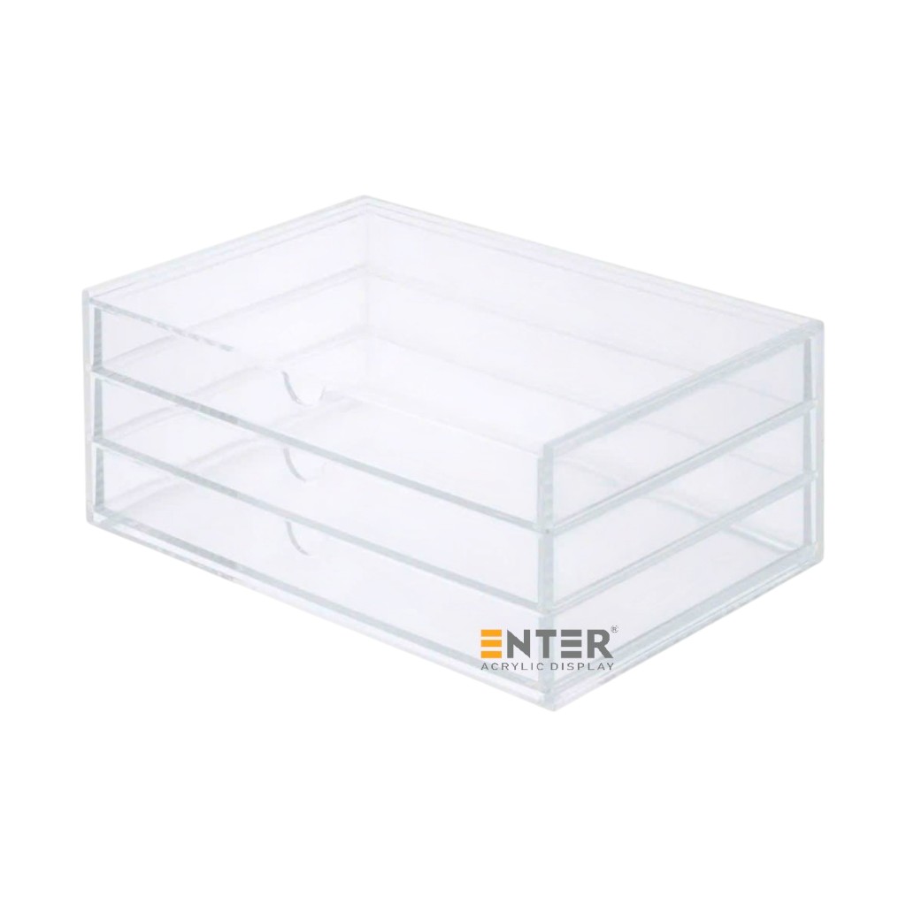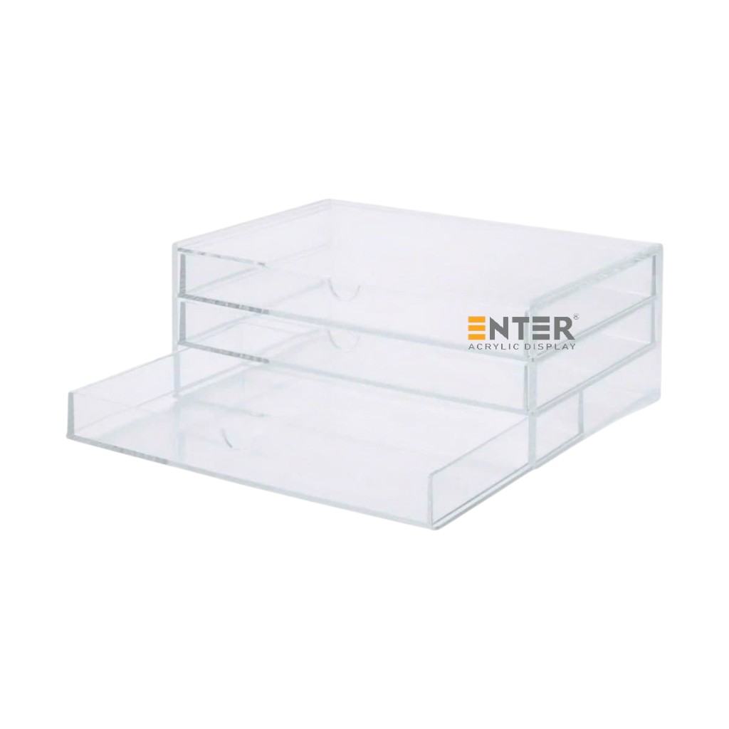 Kệ trưng bày mica Enter TB704 3 ngăn cửa kéo giúp sắp xếp và trưng bày các vật dụng nhỏ một cách gọn gàng, thẩm mỹ. Với thiết kế 2 tầng và cửa kéo tiện lợi, kệ phù hợp để trưng bày mỹ phẩm, phụ kiện, đồ lưu niệm, đồ handmade, đồ chơi mini... tại cửa hàng hoặc ngay trong không gian sống cá nhân. Nhờ chất liệu mica trong suốt, sản phẩm được hiển thị rõ ràng, dễ thu hút ánh nhìn, hỗ trợ tốt cho hoạt động quảng bá, bán hàng cũng như tạo điểm nhấn trang trí tinh tế cho bàn làm việc, bàn trang điểm hoặc kệ sách tại nhà.