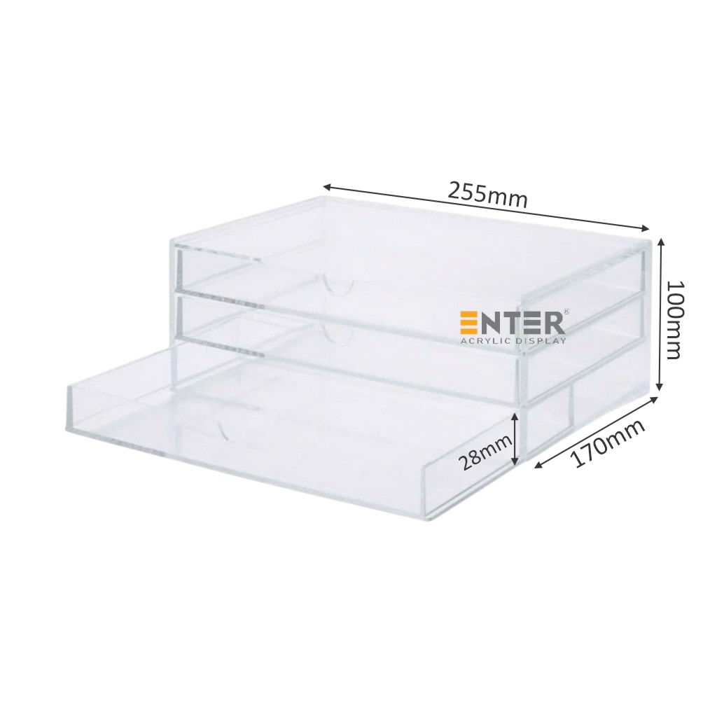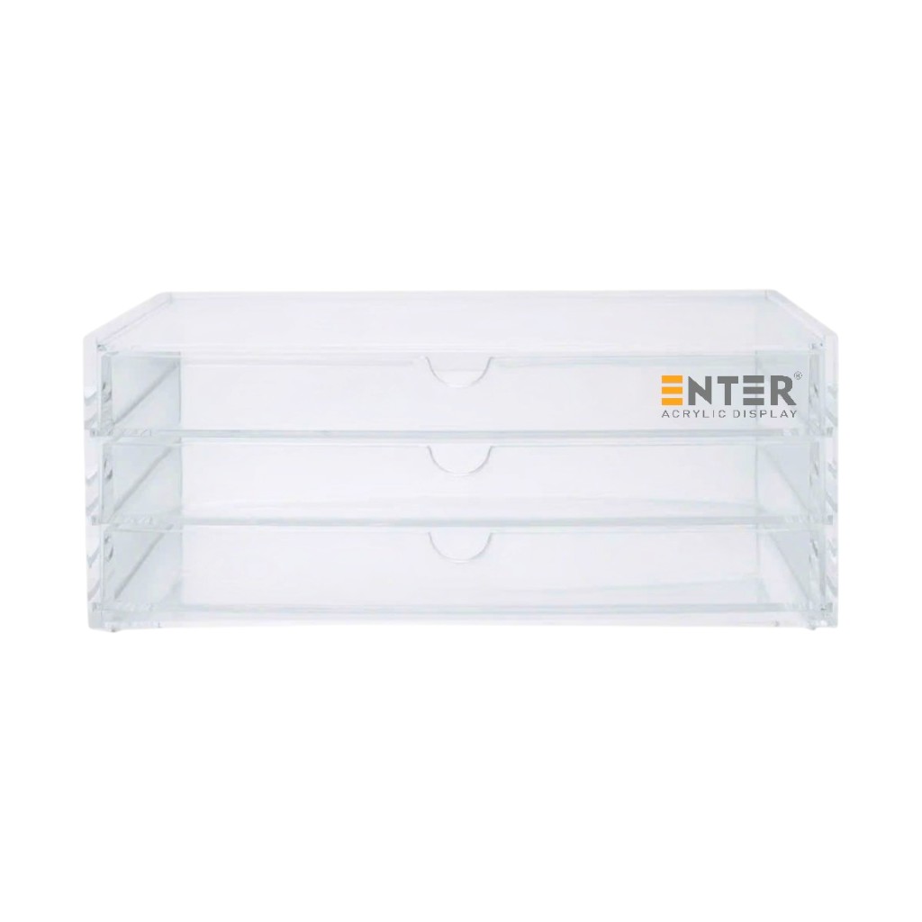 Kệ trưng bày mica Enter TB705 3 ngăn cửa kéo giúp sắp xếp và trưng bày các vật dụng nhỏ một cách gọn gàng, thẩm mỹ. Với thiết kế 2 tầng và cửa kéo tiện lợi, kệ phù hợp để trưng bày mỹ phẩm, phụ kiện, đồ lưu niệm, đồ handmade, đồ chơi mini... tại cửa hàng hoặc ngay trong không gian sống cá nhân. Nhờ chất liệu mica trong suốt, sản phẩm được hiển thị rõ ràng, dễ thu hút ánh nhìn, hỗ trợ tốt cho hoạt động quảng bá, bán hàng cũng như tạo điểm nhấn trang trí tinh tế cho bàn làm việc, bàn trang điểm hoặc kệ sách tại nhà.