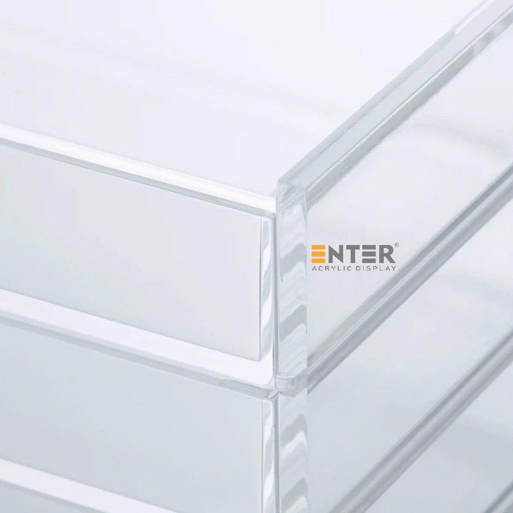 Kệ trưng bày mica Enter TB705 3 ngăn cửa kéo sở hữu thiết kế tối giản nhưng hiện đại, dễ dàng hòa hợp với nhiều không gian nội thất khác nhau. Kệ được làm hoàn toàn từ mica trong suốt cao cấp – bề mặt sáng bóng, không bị mờ đục hay nứt gãy theo thời gian, vừa bền bỉ vừa dễ lau chùi.