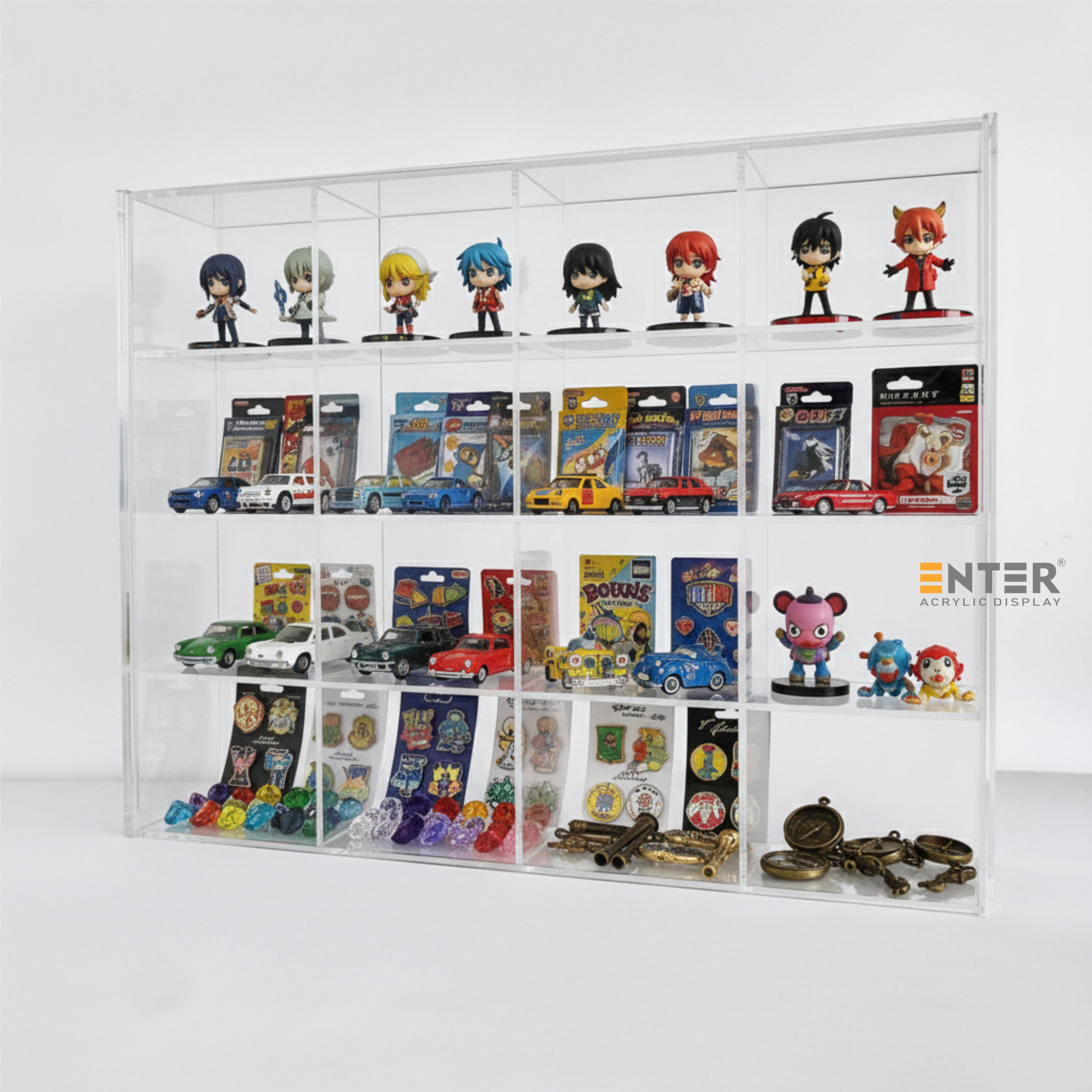 Kệ trưng bày mica Enter TB802 275x70x350mm 16 ô giúp sắp xếp và trưng bày các vật dụng nhỏ một cách gọn gàng, thẩm mỹ. Với thiết kế 2 tầng và cửa kéo tiện lợi, kệ phù hợp để trưng bày mỹ phẩm, phụ kiện, đồ lưu niệm, đồ handmade, đồ chơi mini... tại cửa hàng hoặc ngay trong không gian sống cá nhân. Nhờ chất liệu mica trong suốt, sản phẩm được hiển thị rõ ràng, dễ thu hút ánh nhìn, hỗ trợ tốt cho hoạt động quảng bá, bán hàng cũng như tạo điểm nhấn trang trí tinh tế cho bàn làm việc, bàn trang điểm hoặc kệ sách tại nhà.