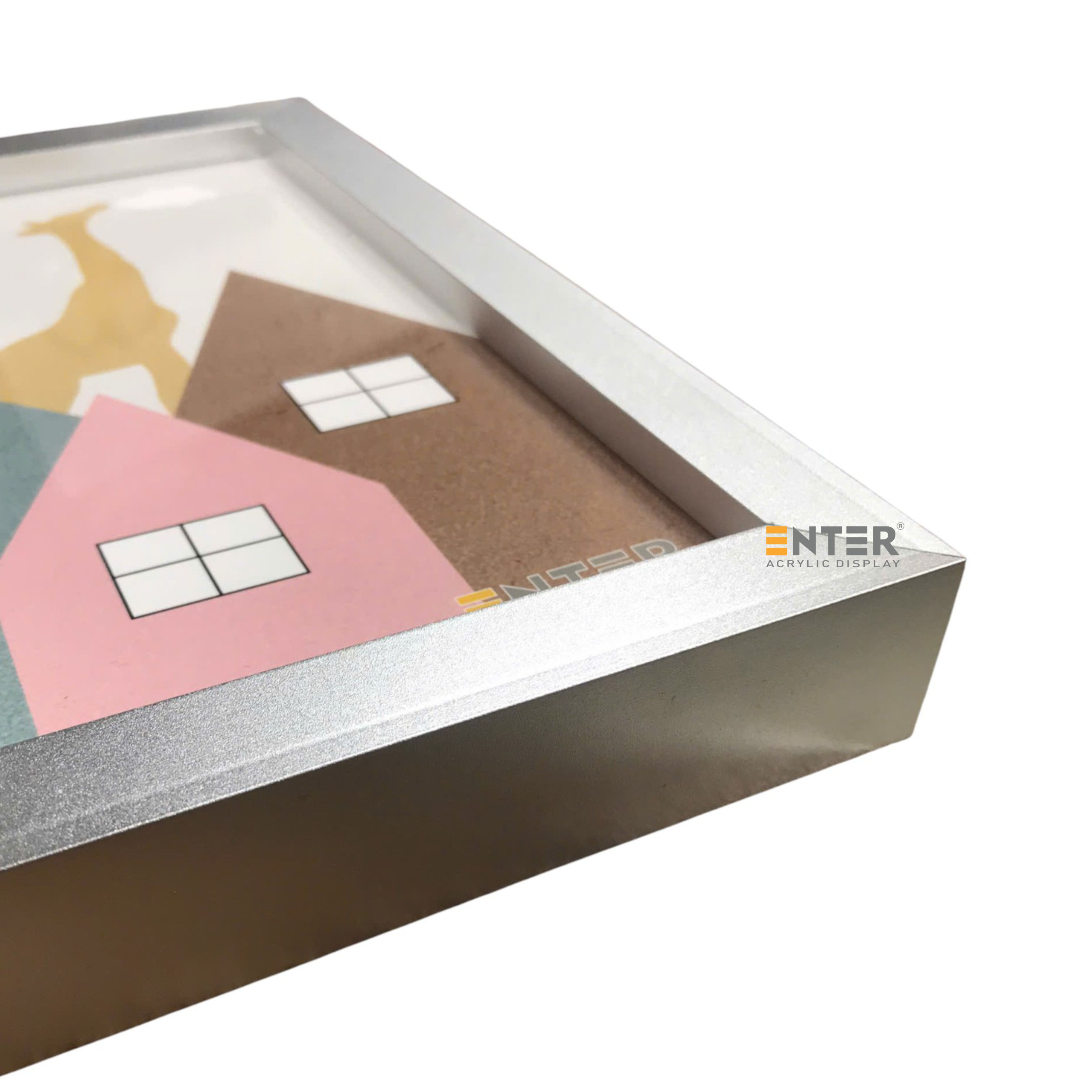 Khung hình nhôm Enter sở hữu thiết kế tối giản, với phần viền được làm từ chất liệu nhôm bền đẹp, có ba tùy chọn màu sắc: vàng, bạc và đen. Sản phẩm có thể được đặt trực tiếp trên bàn hoặc treo tường, linh hoạt phù hợp cho nhiều mục đích trưng bày và sử dụng khác nhau.