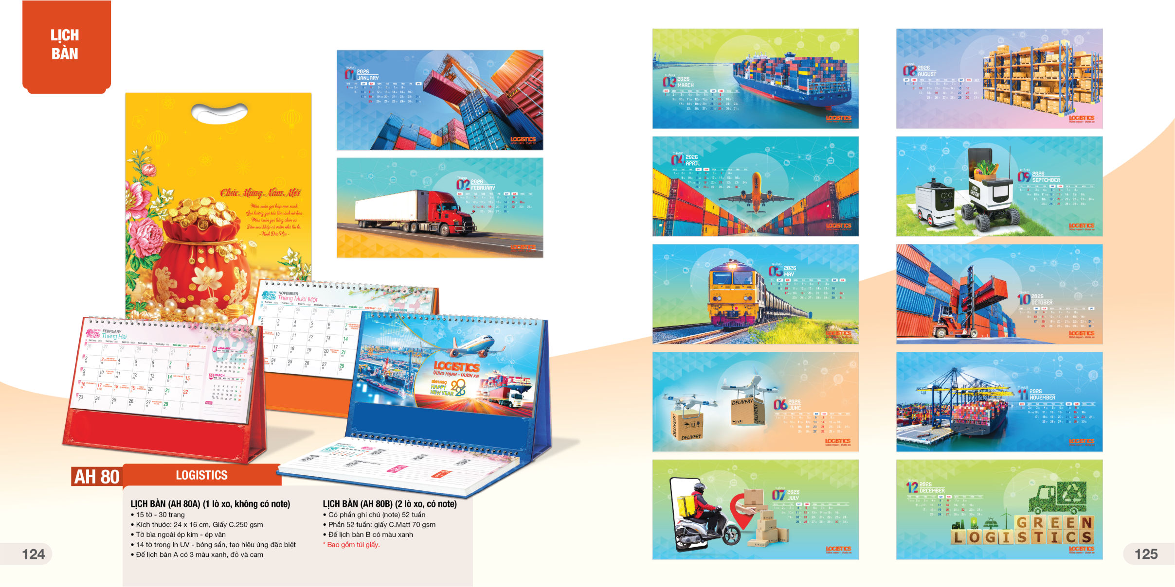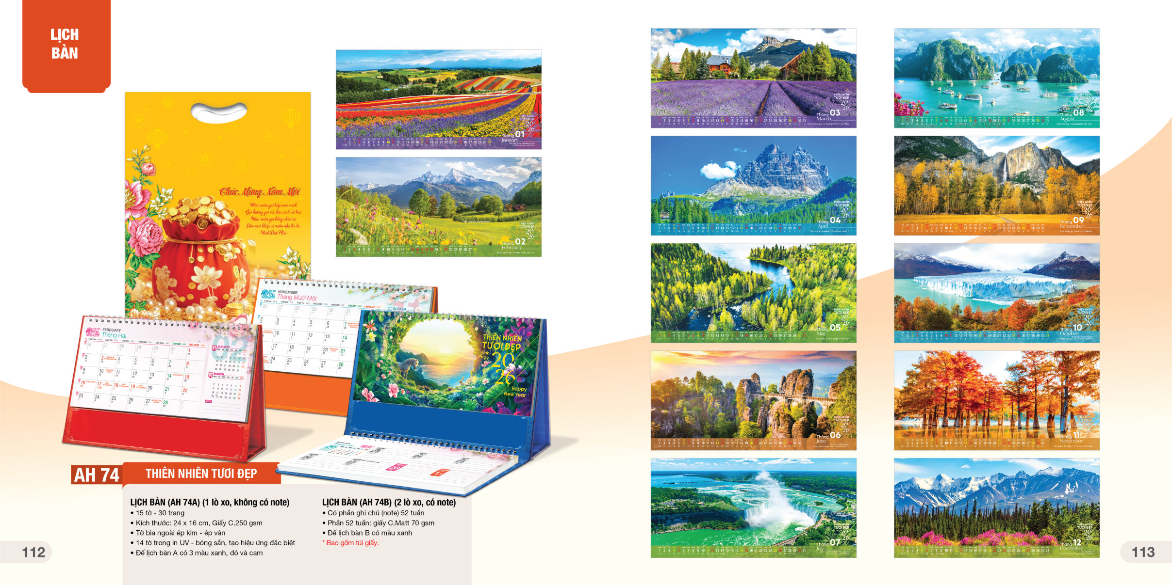 Lịch bàn chữ A AH có phần ghi chú 52 tuần được làm từ giấy C.Matt 70gsm. Đế lịch bàn B có 3 màu xanh, đỏ và cam