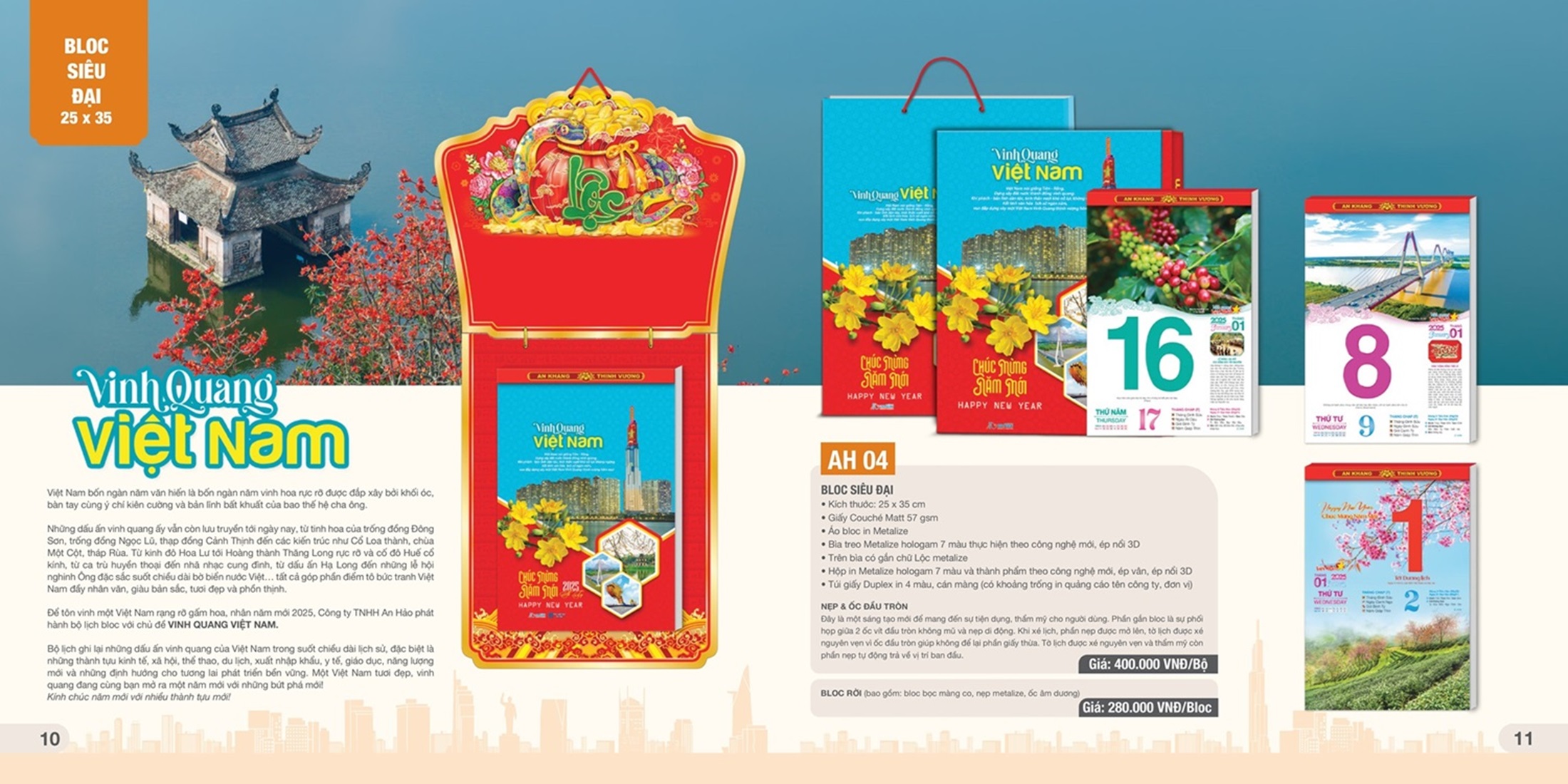 Được làm từ giấy Couché Matt 57gsm, áo bloc in Metalize, bìa treo Metalize hologam 7 màu thực hiện theo công nghệ mới, ép nổi 3D, trên bìa có gắn chữ Lộc Metalize hoặc chữ Lộc cẩm thạch. Phần gắn bloc là sự phối hợp giữa 2 ốc vít đầu tròn không mũ và nẹp di động, khi xé lịch, phần nẹp được mở lên, tờ lịch được xé nguyên vẹn vì ốc đầu tròn giúp không để lại phần giấy thừa. Tờ lịch được xé nguyên vẹn và thẩm mỹ còn phần nẹp tự động trả về vị trí ban đầu.