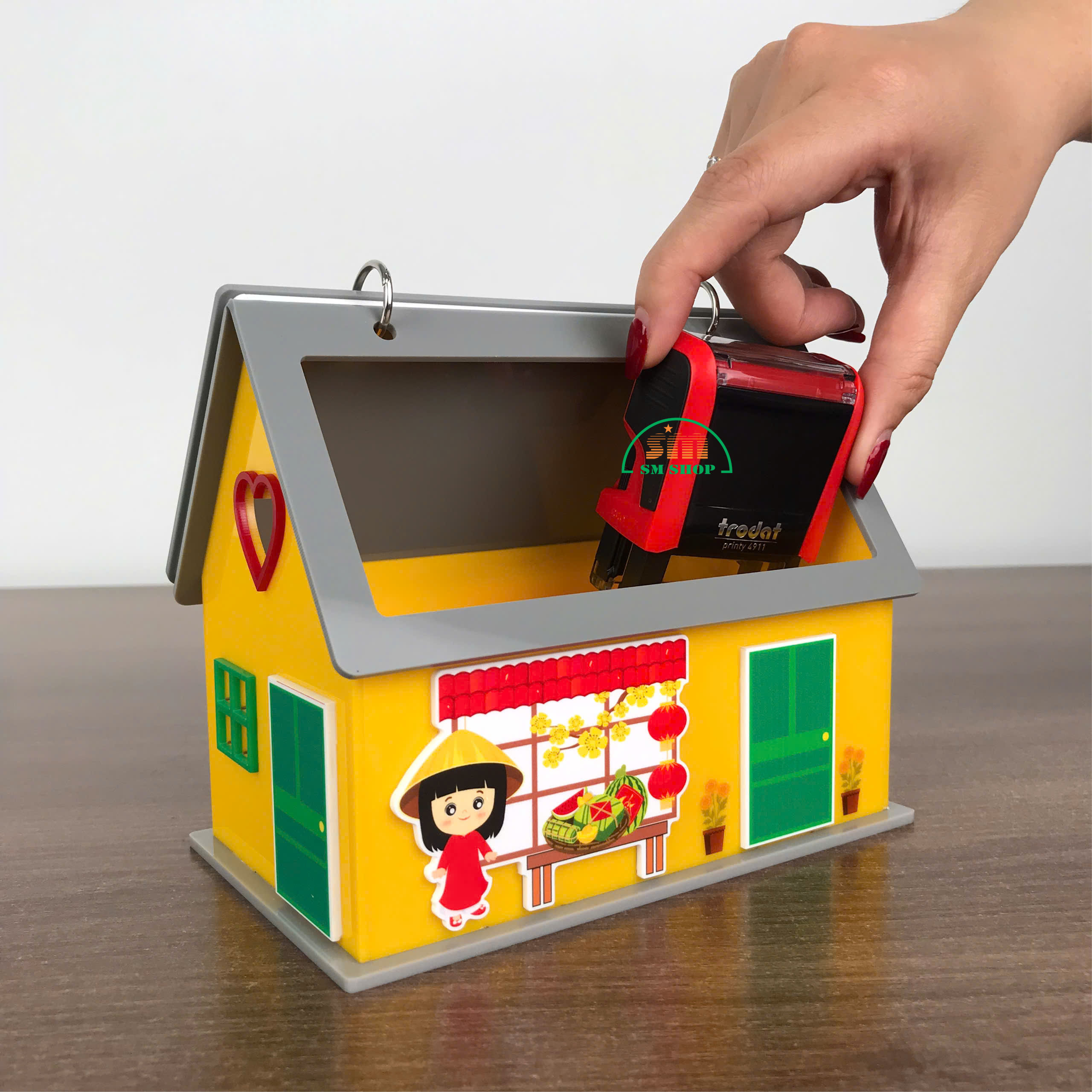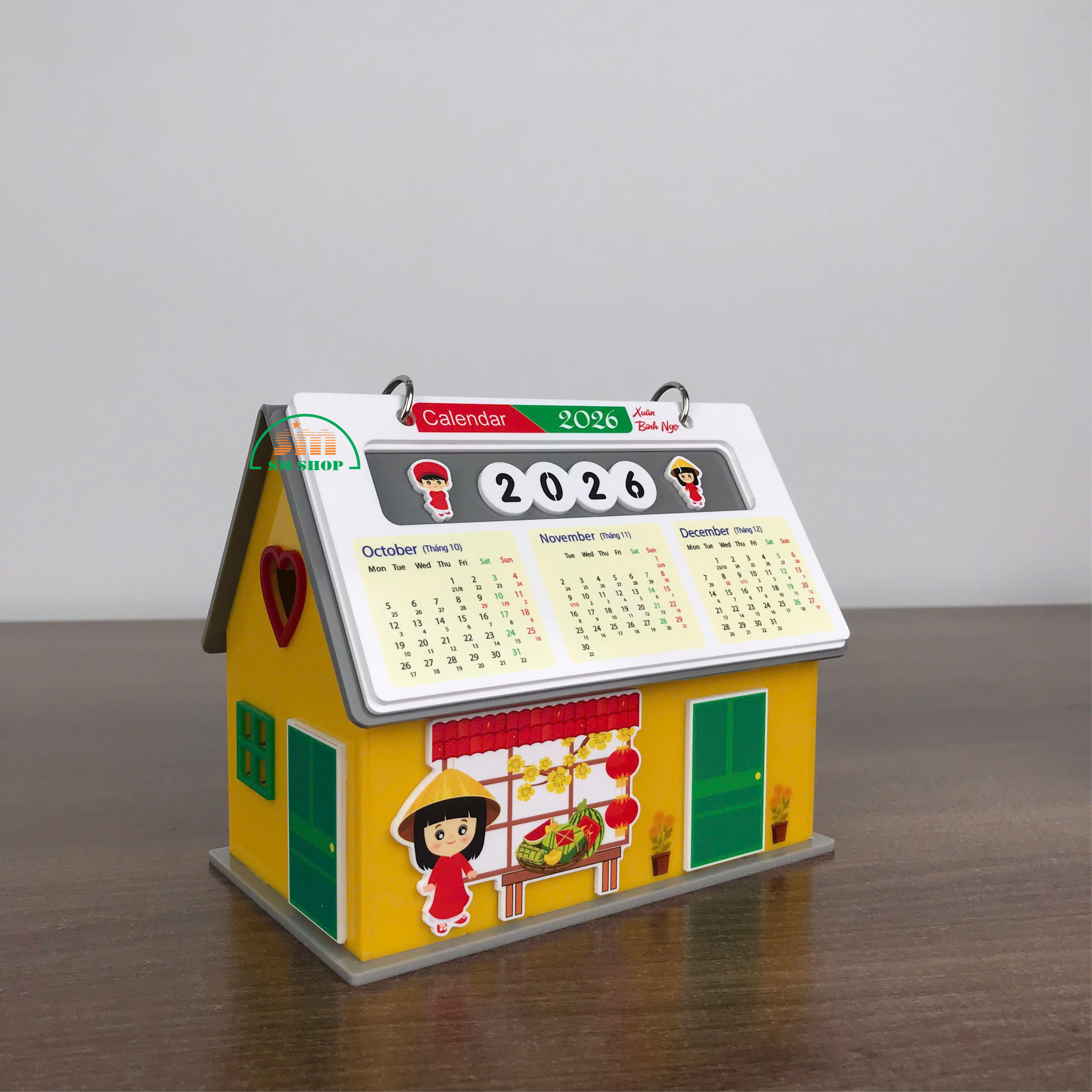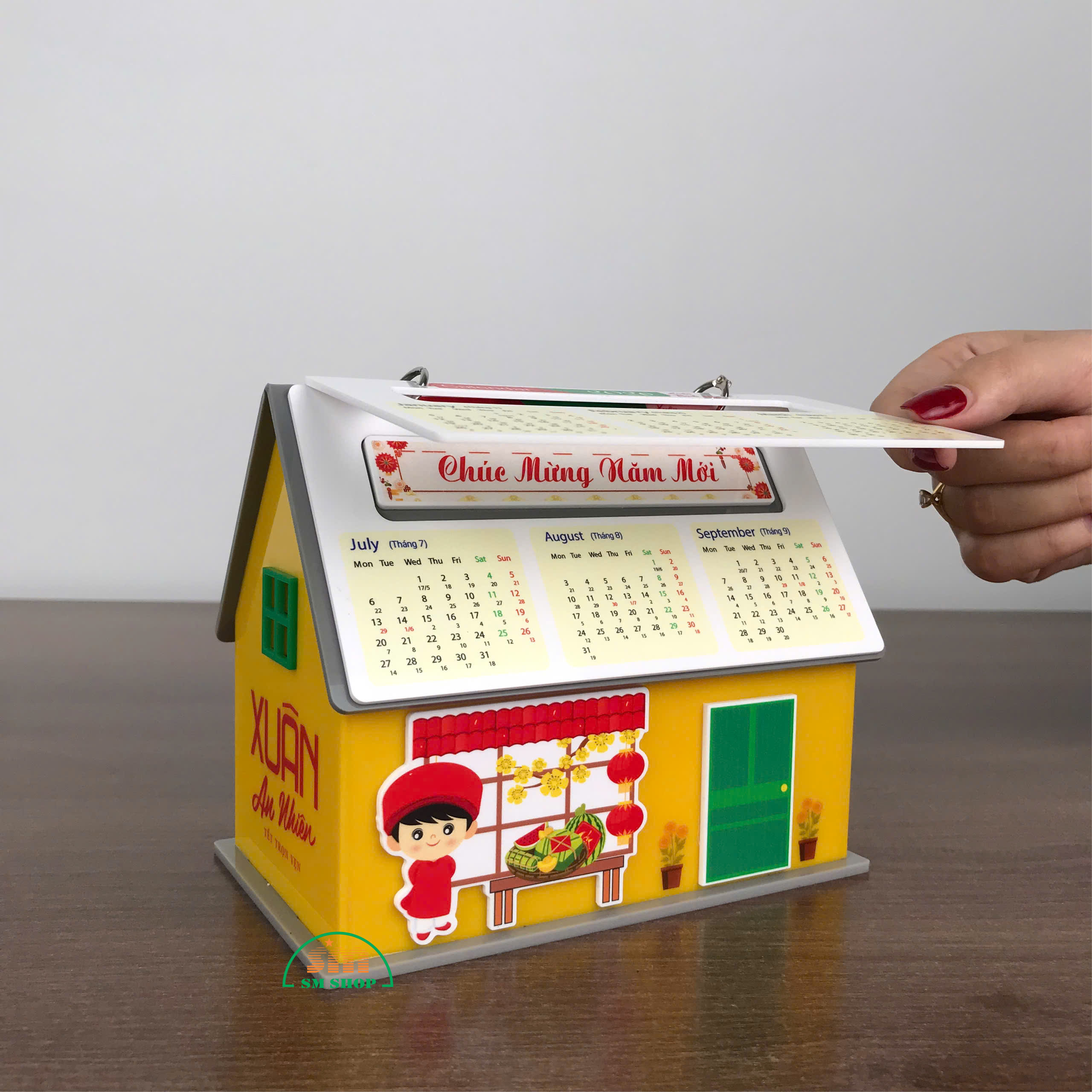 Sản phẩm lịch để bàn hình ngôi nhà không chỉ là vật trang trí xinh xắn, mang không khí Tết ấm áp, mà còn rất tiện ích với không gian bên trong rộng rãi, cho phép lưu trữ các văn phòng phẩm và đồ dùng học tập như kim bấm, bút viết, giấy note, giúp bàn làm việc hay góc học tập luôn gọn gàng, ngăn nắp. Thiết kế này kết hợp tính thẩm mỹ và công năng, biến sản phẩm thành món quà trang trí hữu dụng, vừa đẹp mắt vừa tiện lợi. Ngoài ra, sản phẩm còn phù hợp làm quà tặng, trang trí văn phòng, hoặc in logo, quảng bá thương hiệu, mang lại giá trị sử dụng và truyền thông hiệu quả.