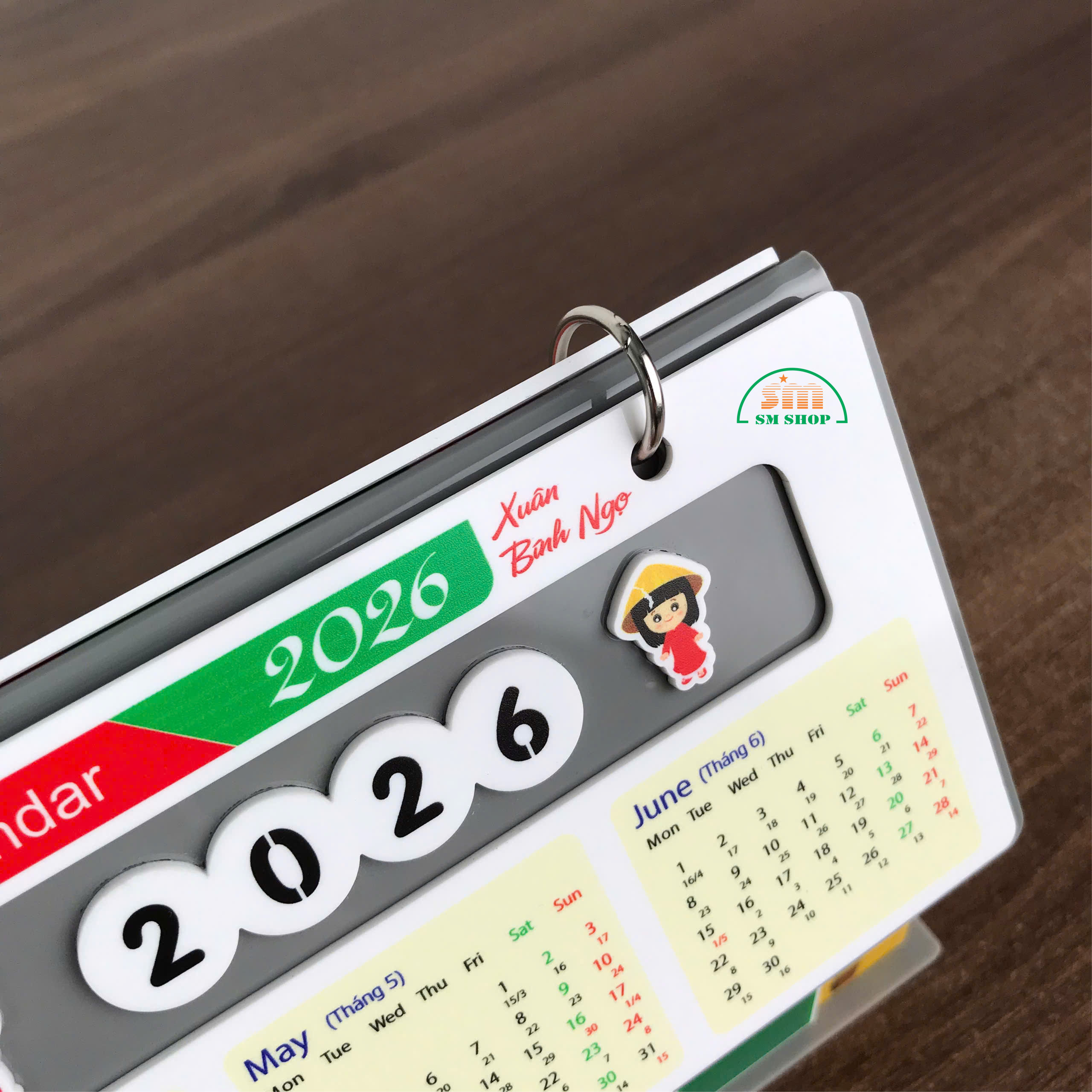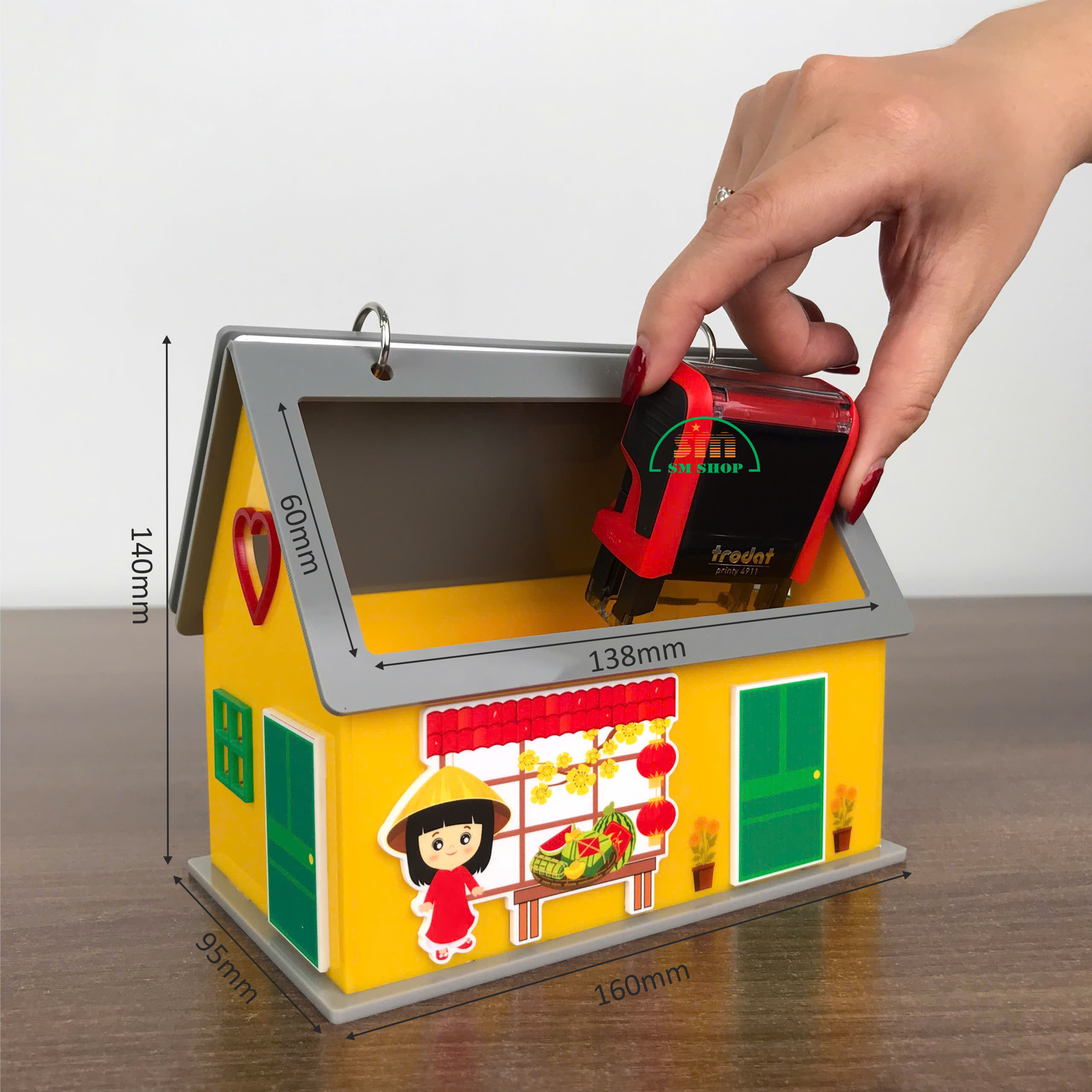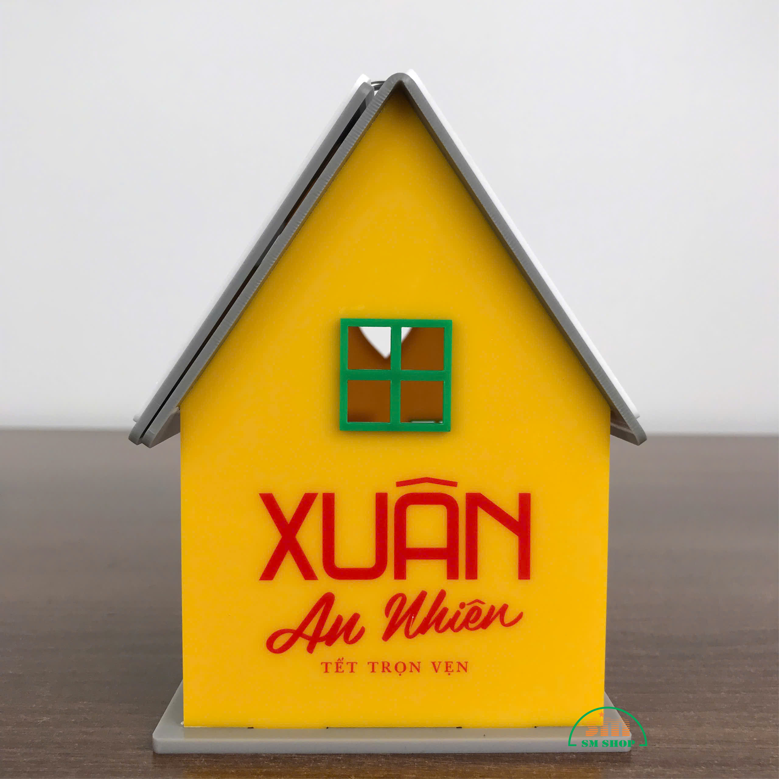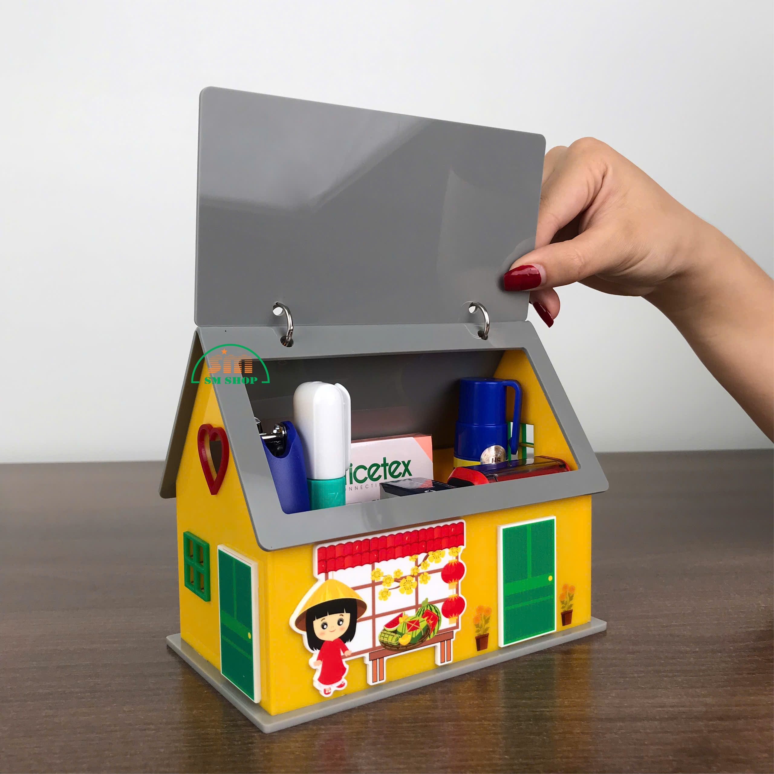 Sản phẩm được làm từ mica cao cấp, bề mặt bóng mịn, bền màu. Với thiết kế hình ngôi nhà nhỏ xinh xắn, trang trí theo tông màu rực rỡ của mùa xuân, kết hợp những họa tiết Tết truyền thống như bánh chưng, bánh tét, hoa mai, cùng hình ảnh người mặc áo dài, tạo nên không khí Tết ấm áp, vui tươi. Các góc bo tròn tinh tế vừa đảm bảo an toàn khi sử dụng, vừa nâng cao tính thẩm mỹ mềm mại. Đây không chỉ là một vật dụng tiện ích trên bàn làm việc hay bàn học, mà còn là món quà trang trí ý nghĩa, gợi nhắc những giá trị văn hóa Tết truyền thống.