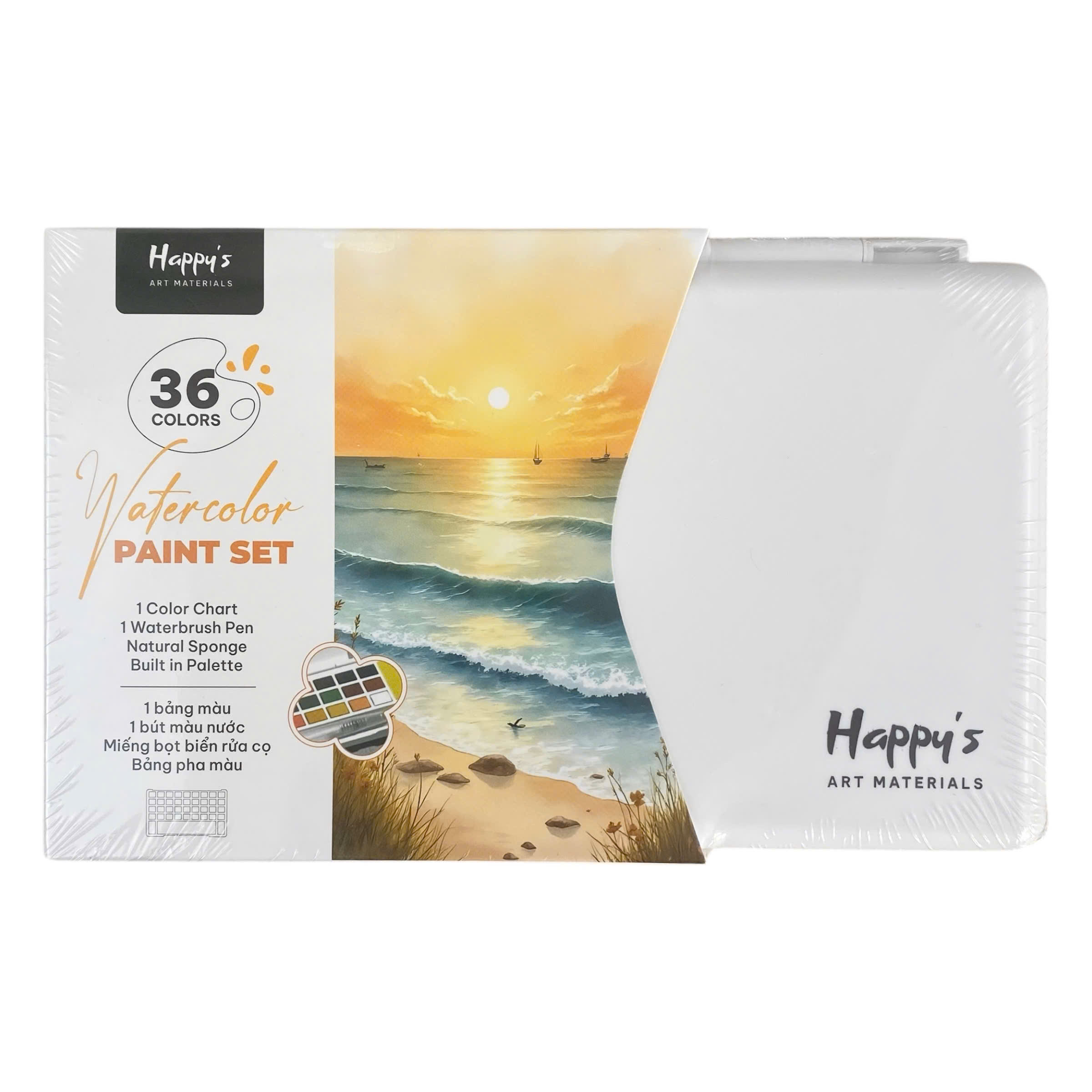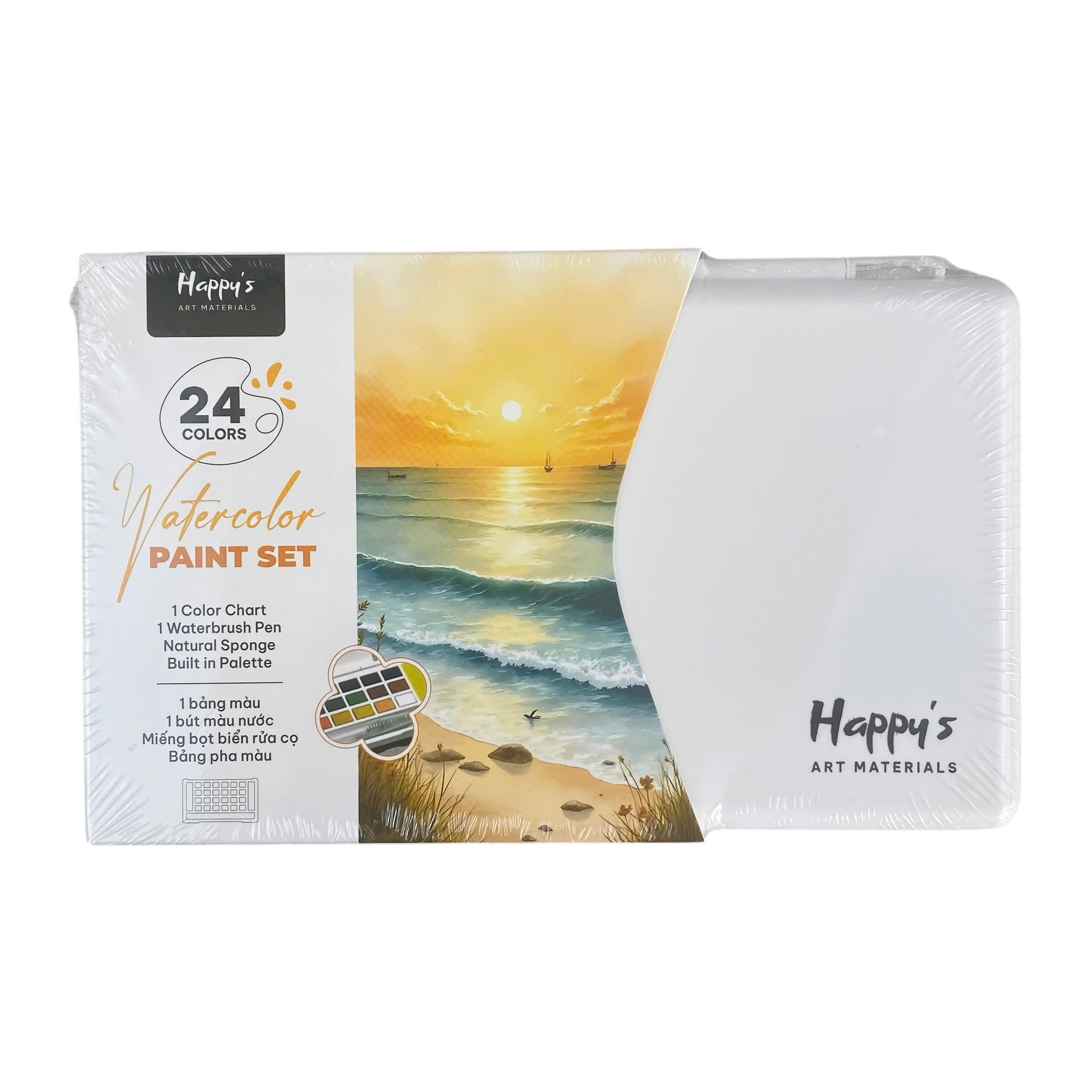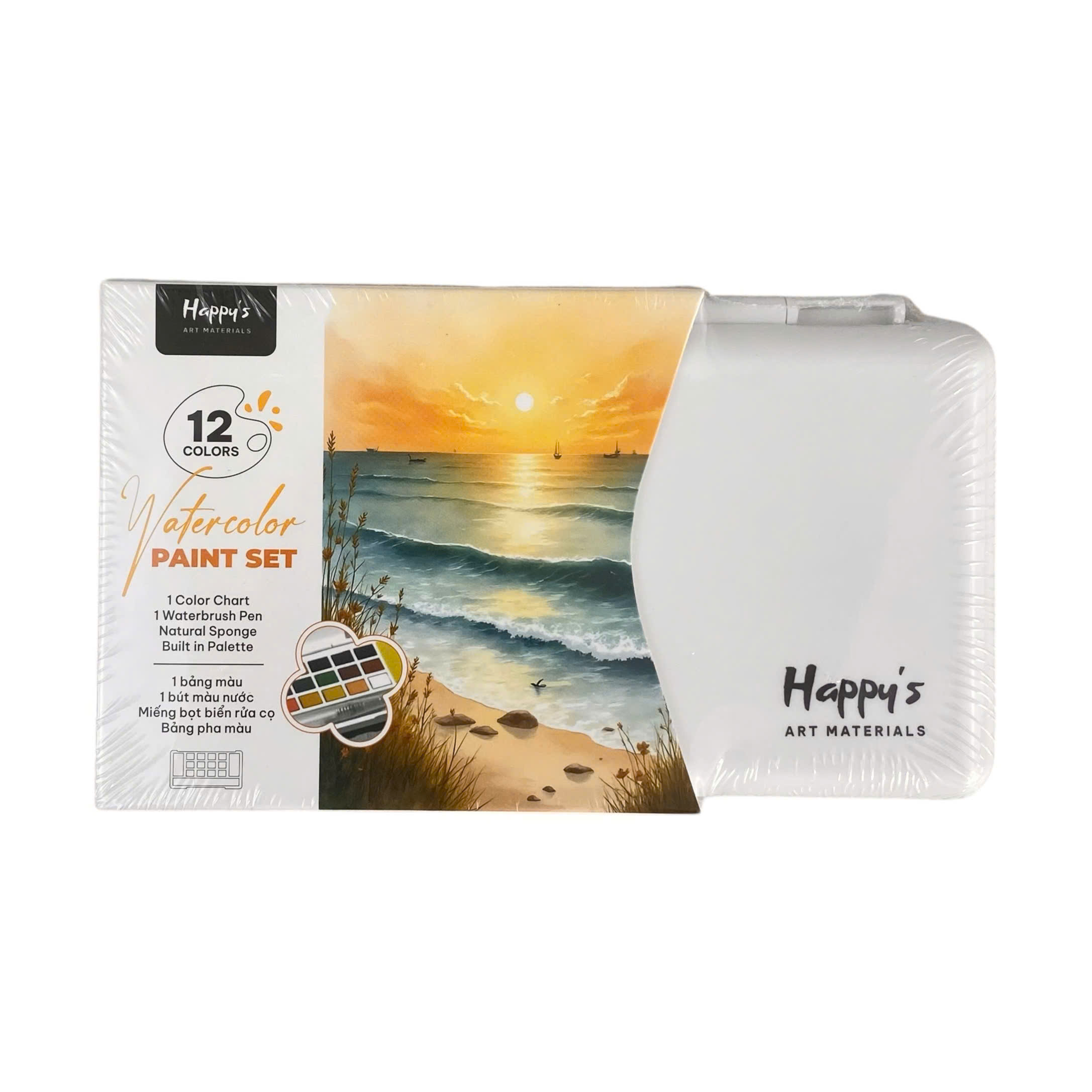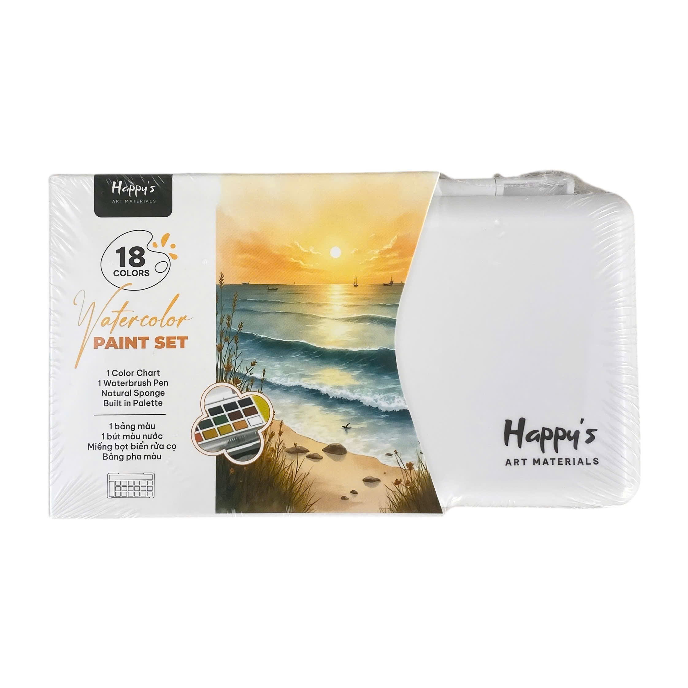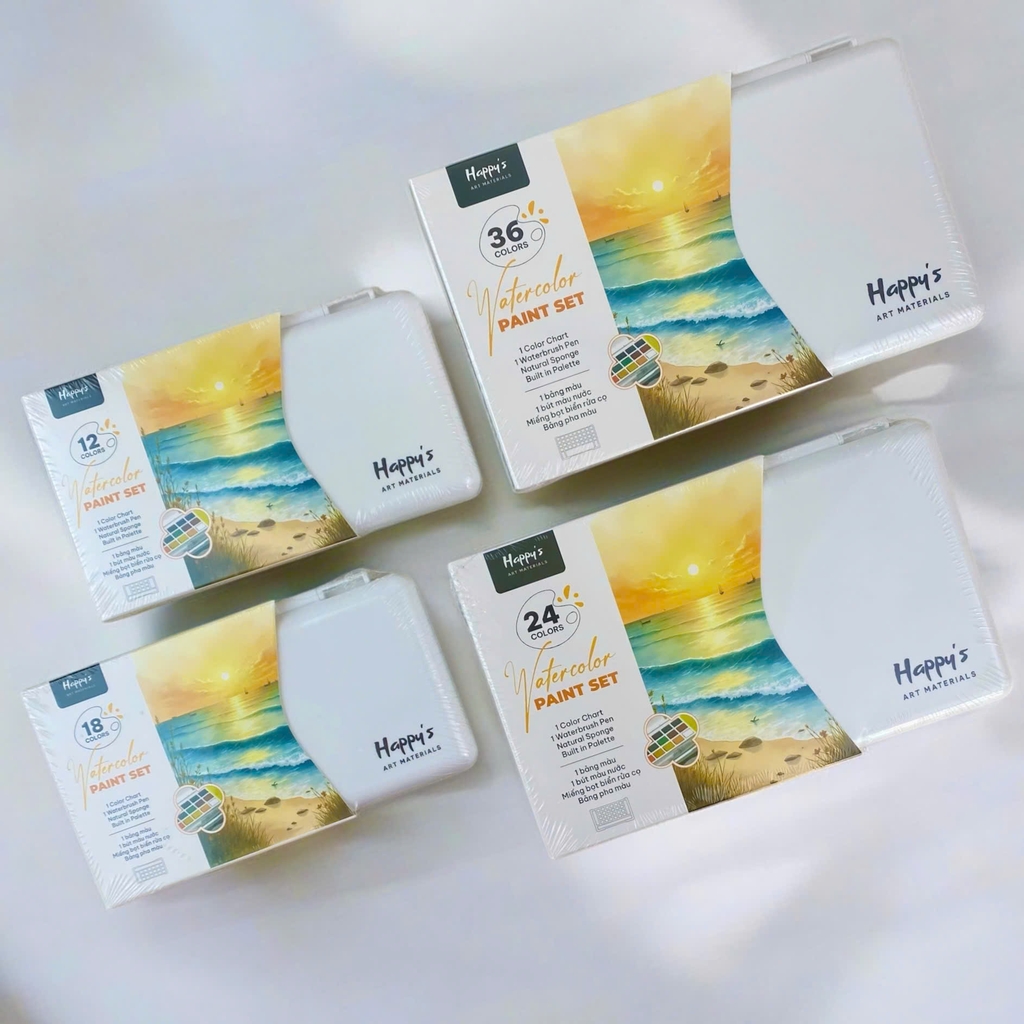 Màu nước Happy được làm từ chất liệu an toàn, các bánh màu có độ mịn cao, dễ hòa tan trong nước và cho màu sắc trong trẻo, tươi sáng. Hộp đựng bằng nhựa cứng nhẹ, bền, giúp bảo quản màu tốt và thuận tiện khi mang theo. Bảng pha màu tích hợp có bề mặt nhẵn, dễ lau chùi sau khi sử dụng. Bút nước và miếng bọt biển đi kèm được làm từ vật liệu thân thiện, hỗ trợ kiểm soát lượng nước tốt, giúp quá trình vẽ màu nước trở nên linh hoạt và dễ dàng hơn.