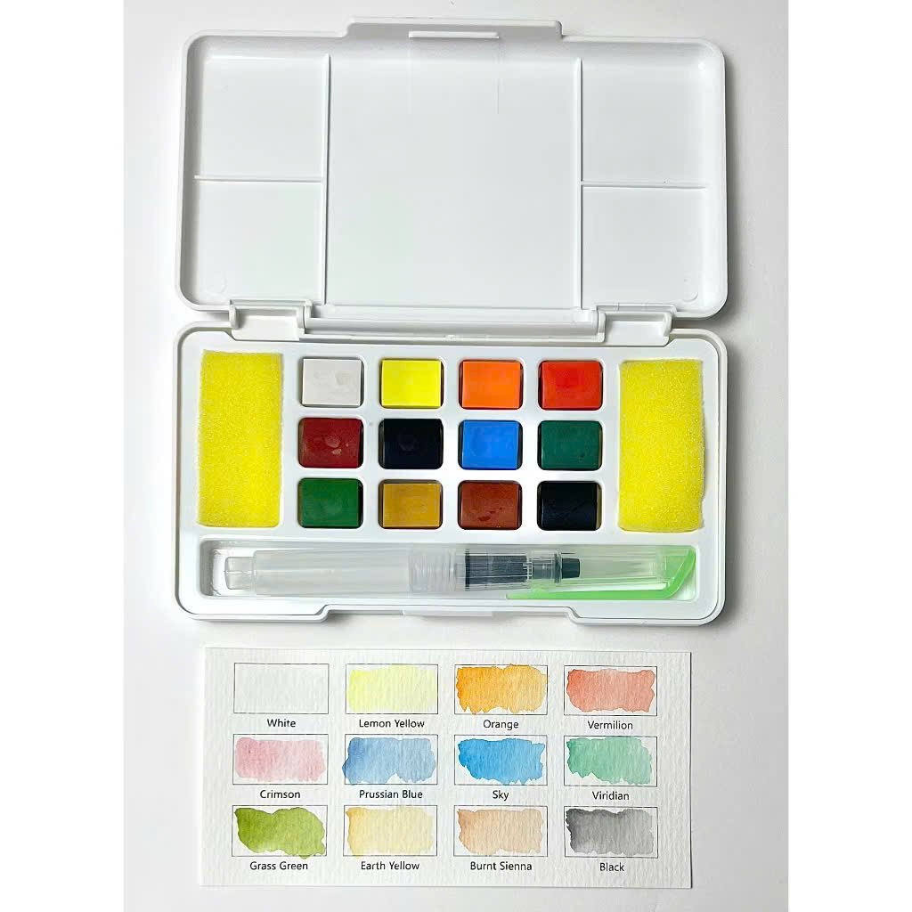 Bộ màu nước dùng để vẽ tranh màu nước, tô màu và rèn luyện các kỹ thuật hội họa cơ bản như loang màu, pha trộn sắc độ và tạo hiệu ứng ánh sáng. Sản phẩm có màu sắc tươi sáng, độ lên màu và khả năng phủ màu tốt, dễ pha trộn, phù hợp để tô vẽ, trang trí trên giấy tập tô màu, giấy vẽ chuyên dụng, tượng thạch cao và nhiều bề mặt sáng tạo khác. Bộ màu đáp ứng nhu cầu học tập, sáng tạo nghệ thuật, vẽ ký họa và thư giãn, phù hợp cho người mới học vẽ đến người vẽ bán chuyên, đồng thời tiện lợi khi sử dụng tại nhà hoặc mang theo vẽ ngoài trời.
