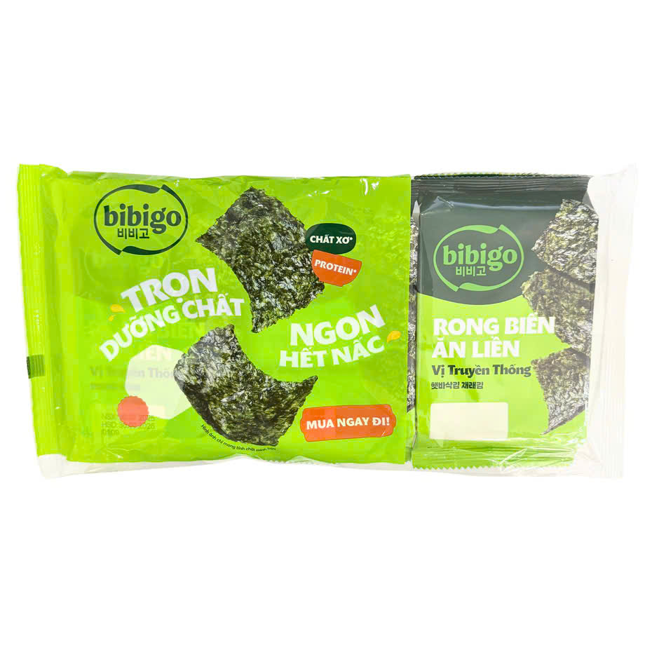 Rong biển Bibigo vị truyền thống giòn thơm, đậm vị Hàn với rong biển nướng cùng dầu thực vật và gia vị nhẹ, ăn là ghiền. Dùng ăn liền, ăn với cơm hoặc cuộn kimbap đều ngon, tiện lợi và phù hợp mọi lứa tuổi.