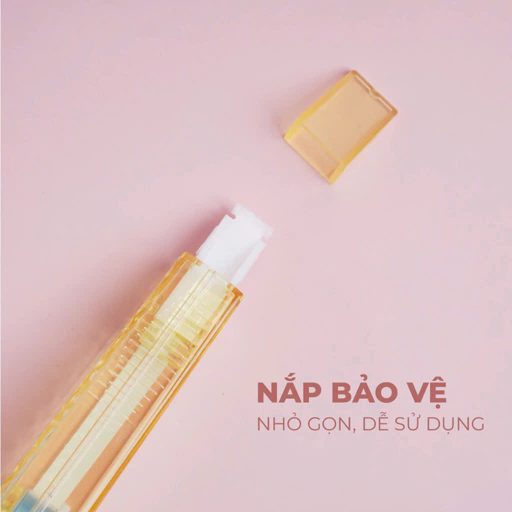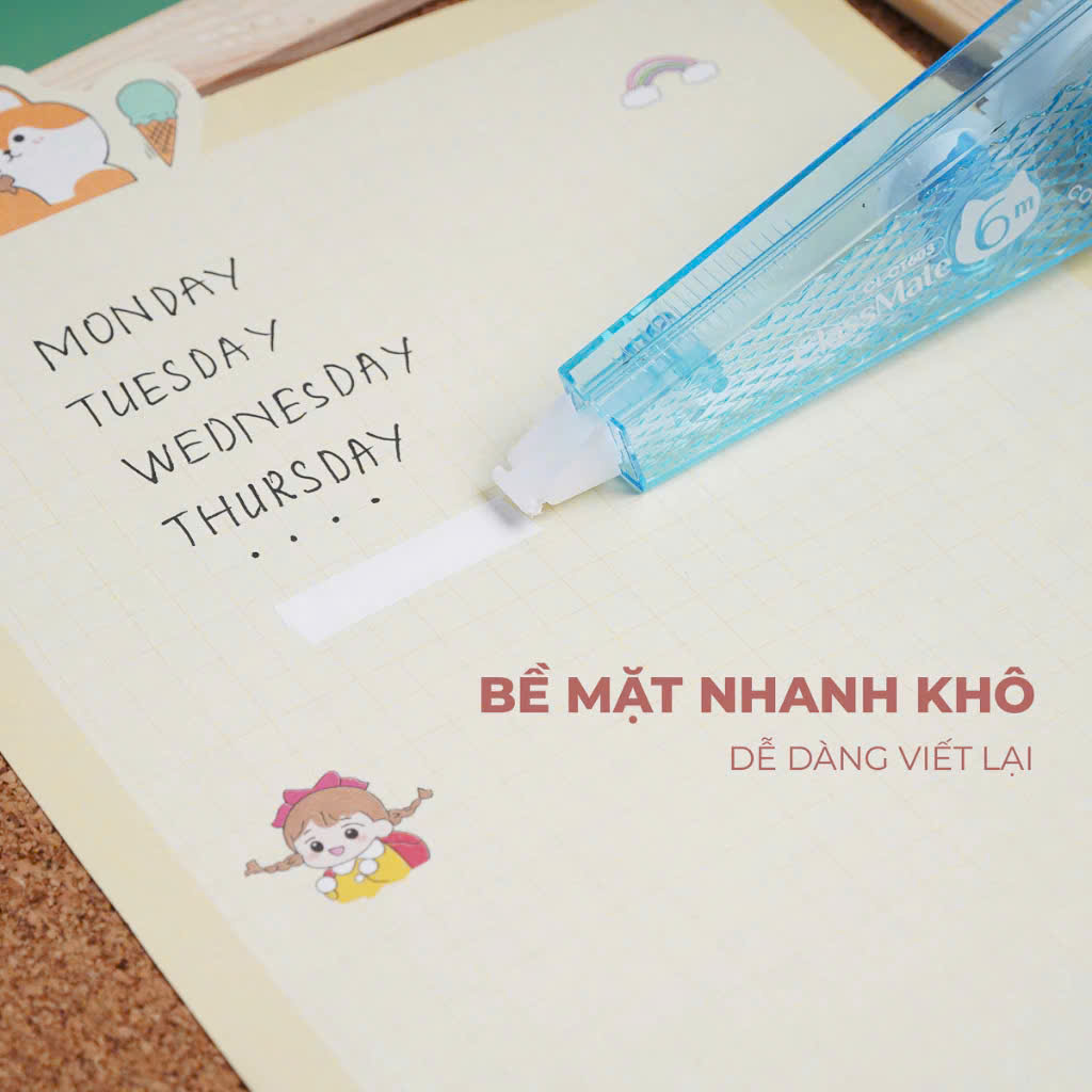 Sản phẩm có thiết kế thon gọn, dễ dàng cầm nắm và sử dụng. Bút được làm từ chất liệu nhựa có màu sắc pastel nhẹ nhàng, xinh xắn. Vỏ bút cứng cáp để bảo vệ dải băng xóa bên trong, hệ thống bánh răng cưa giúp cho băng xóa ra đều, ít bị rối.