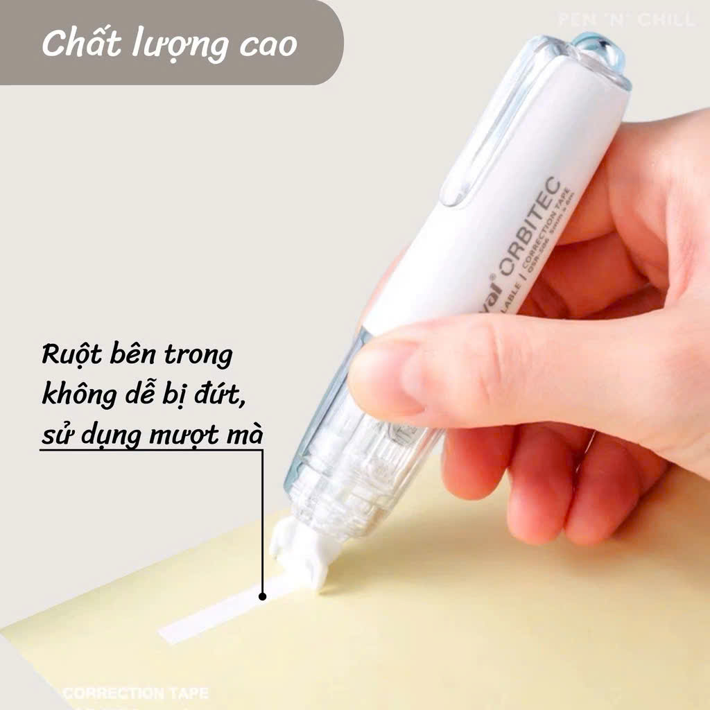 Sản phẩm có thiết kế thon gọn, dễ dàng cầm nắm và sử dụng. Bút được làm từ chất liệu nhựa có màu sắc pastel nhẹ nhàng, xinh xắn. Vỏ bút cứng cáp để bảo vệ dải băng xóa bên trong, hệ thống bánh răng cưa giúp cho băng xóa ra đều, ít bị rối.